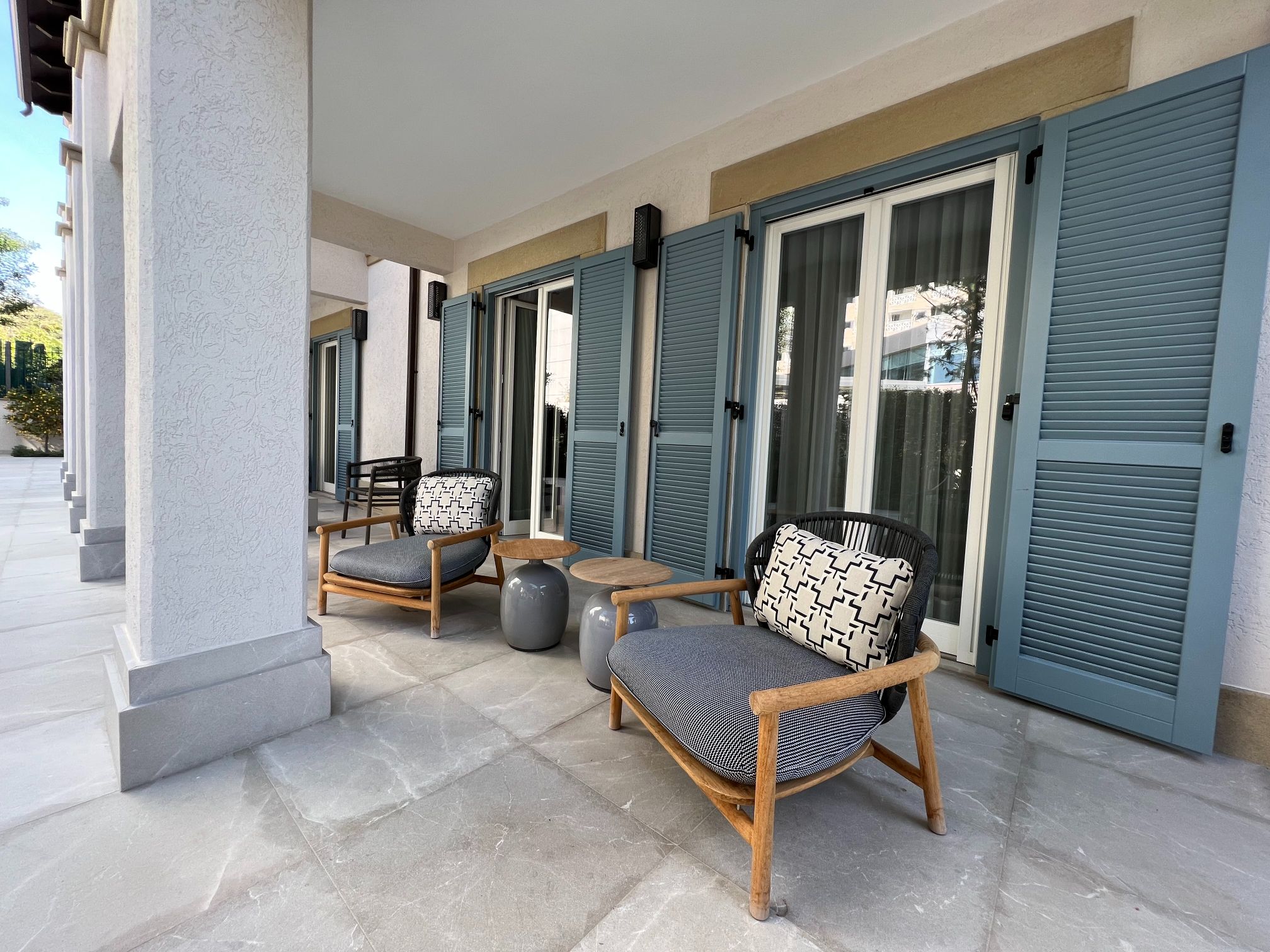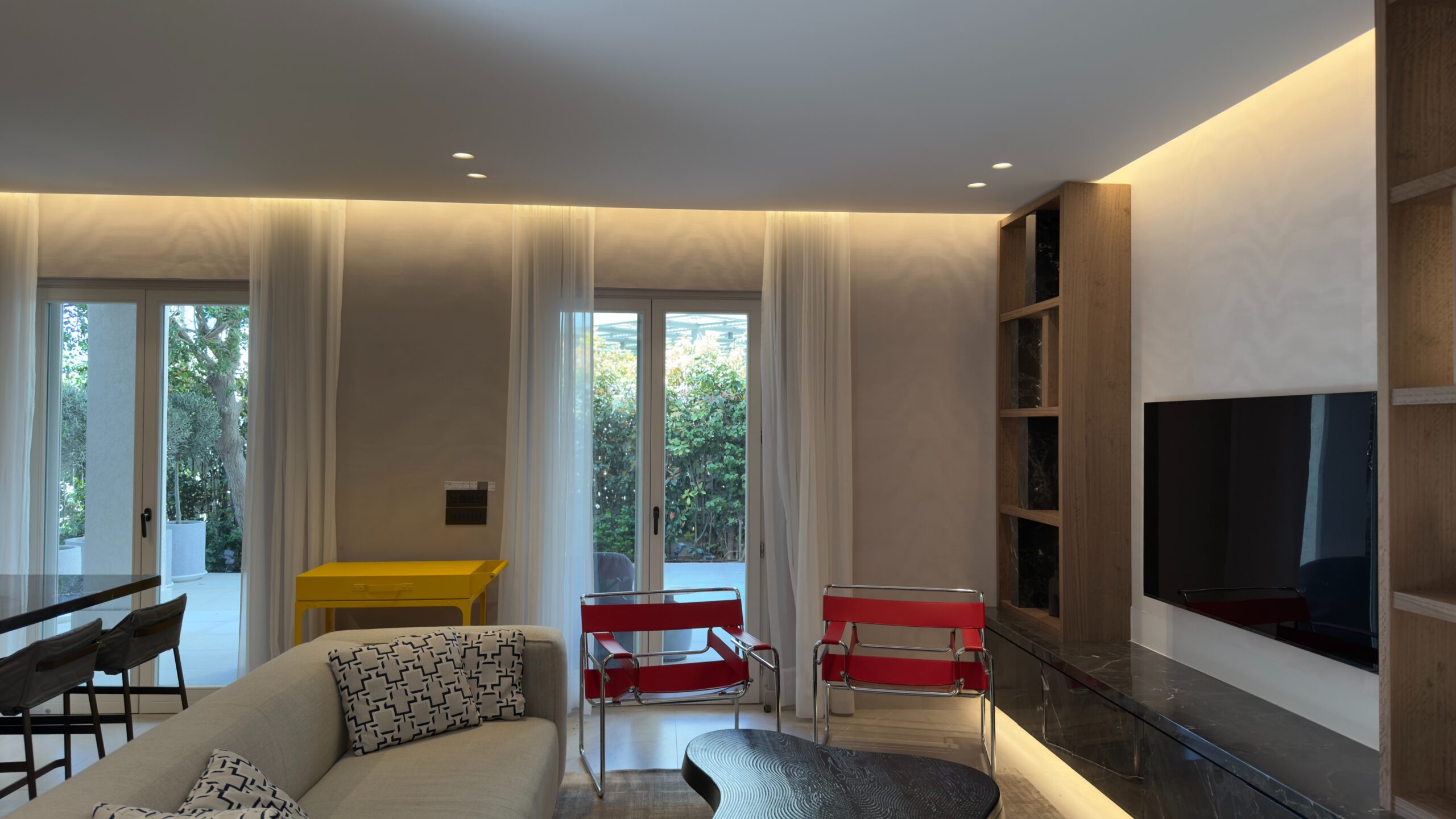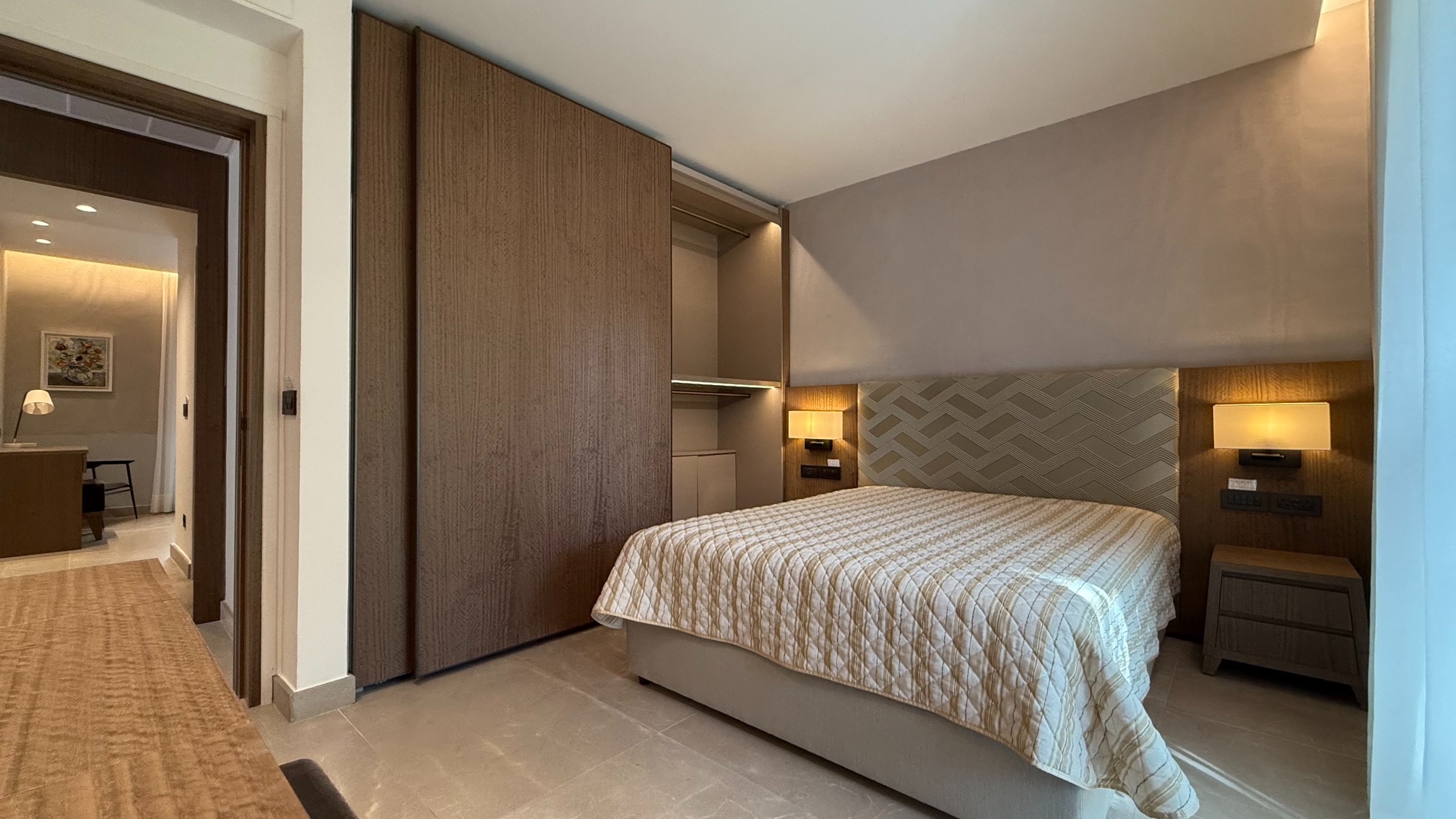 The first line, fully renovated to the highest standard 2-bedroom ground floor apartment, is located in the most impressive gated complex near the beach- The Residence complex is now available for rent. The complex has security 24/7, a large swimming pool, a gym area, private access to the beach, and beautiful, well-maintained mature gardens. The apartment is located 100 meters from the Mediterranean Sea. The covered area is 102sq.m, covered veranda is 16sq.m and plot 185sq.m. The property is fully furnished and equipped with electrical appliances. It has 2 bathrooms (showers), 2 spacious bedrooms with built-in wardrobes, a living room and dining areas, a laundry room, an open-plan kitchen, and windows (manual) shutters. Water pressure system, photovoltaic, underfloor heating(water), and VRV air-conditioning system (hot/cold). Also, there is a BBQ outside. Title deeds are available.
