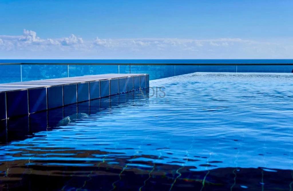 • Saltwater swimming pool with a waterfall feature.