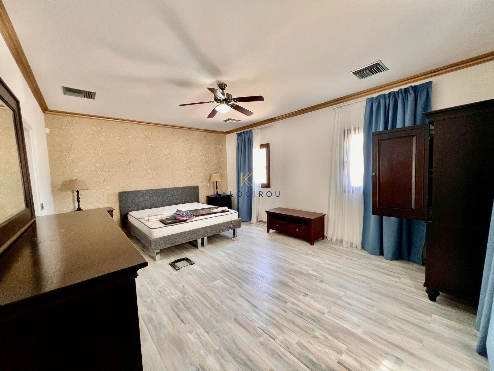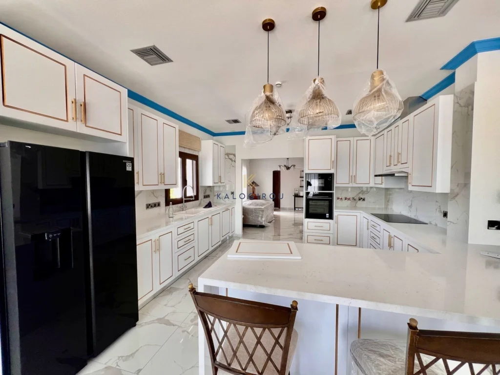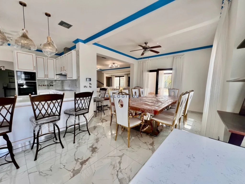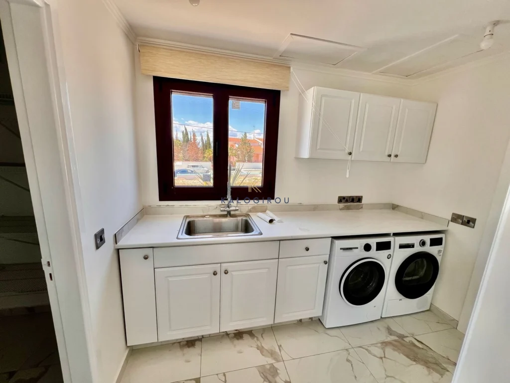 Double-storey Villa for rent in Dekeleia area, Larnaca. The property features five spacious bedrooms, two on the ground floor and three on the first floor along with four bathrooms and a guest WC. On the ground level, you’ll also find a dedicated office space, a large open-plan living and dining area, a separate fully-equipped kitchen, and an additional utility kitchen. The villa comes fully furnished and equipped with all necessary electrical appliances, making it move-in ready.