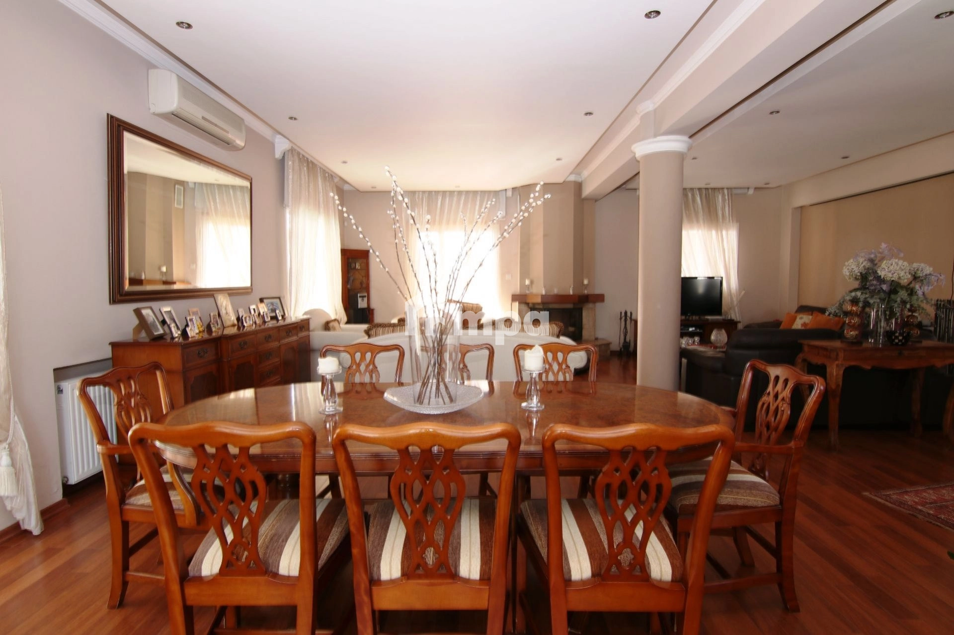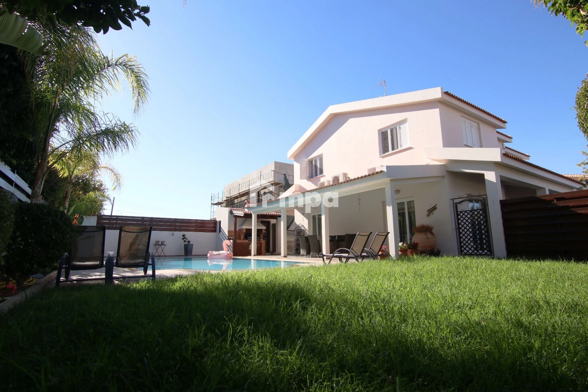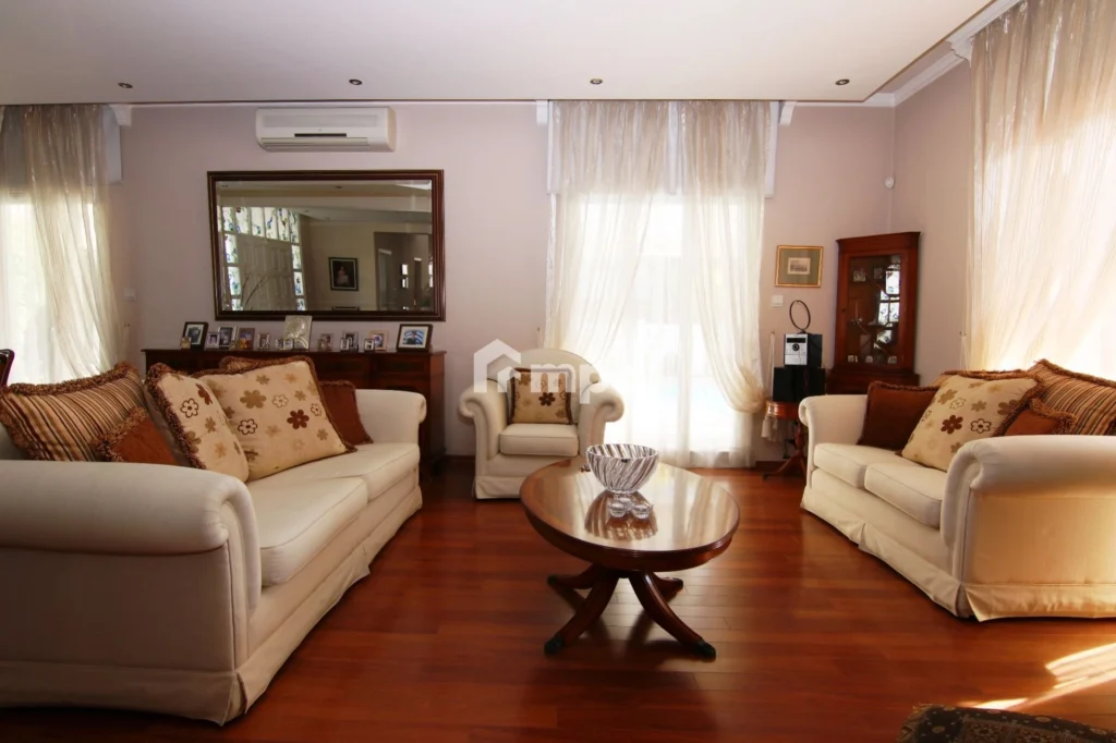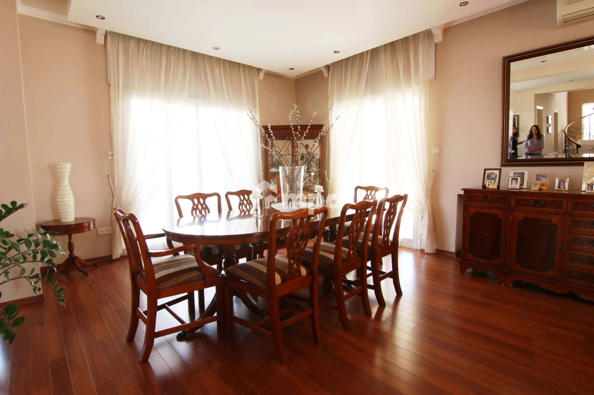 Amazing detached house with a lovely garden and a swimming pool in a prominent, residential location in Egkomi, behind Tymvos. The house is located in a quiet area, parallel to Iroon Street and within easy access to all amenities. This impressive two-level house is comprised of 385 sqm of covered areas in a plot of 604 sqm. The house is comprised of two levels and a basement. The first level contains a spacious living and dining area with a fireplace, an office, a guest toilet and a seperate fully equipped kitchen. The second level contains 3 spacious bedrooms (one of which en suite and with a walking closet), a smaller bedroom and the family bathroom. The basement is comprised of a play room. In the basement there is also a two bedroom fully equipped apartment. The outside area is comprised of a 10 x 5 swimming pool, a nicely landscaped garden, covered verandas and a BBQ area. The house has central heating (using gas) & A/C in all the rooms, solar panels, its own water, irrigation system wooden flooring and a jacuzzi.