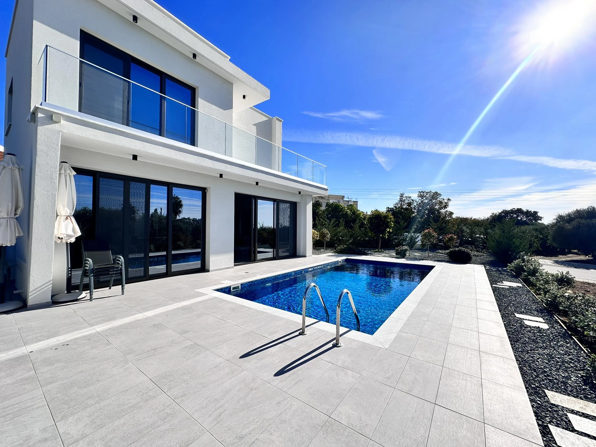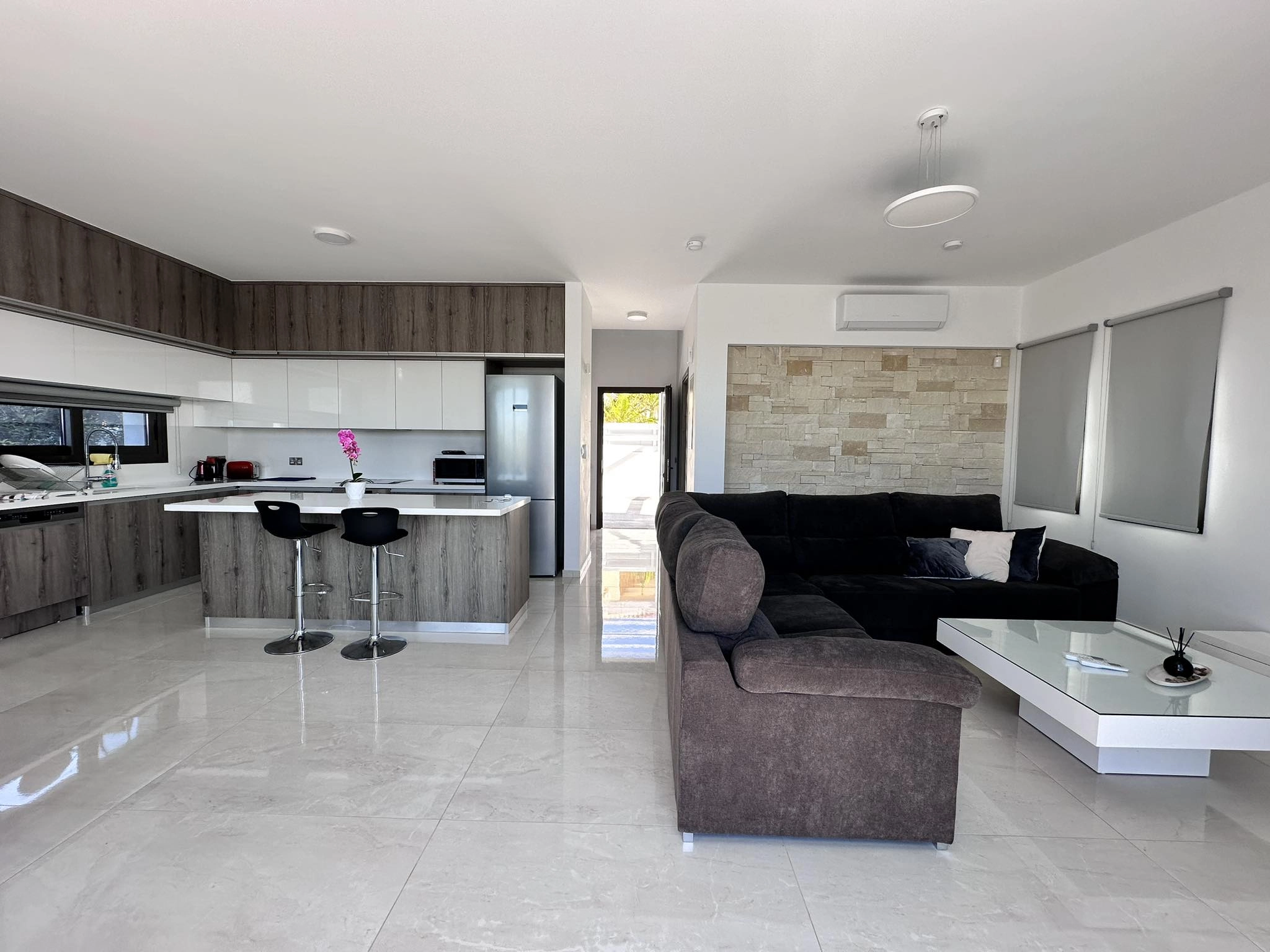 This contemporary villa is located in Emba, Paphos. Emba is a traditional Cypriot village and an ideal location for those seeking the peaceful village life, while still being close enough to everything one could possibly need.  Within the village itself there are a handful of taverns and coffee shops, small mini markets and other amenities.  There are also a number of churches and schools within the area.  Emba is just a short drive away from a choice of beaches, larger supermarkets and Paphos harbour. Nestled within a pleasant village setting, this remarkable 3 bedroom villa, accompanied by an office space, unveils a harmonious fusion of modern design and breathtaking sea views. immaculately furnished to the highest standards, this residence is complete with everything required for a more than comfortable lifestyle. The ground floor unfolds with an inviting open plan layout, seamlessly integrating the living, dining, and fully equipped kitchen areas. Large patio doors create a natural transition between the interiors and the meticulously landscaped garden, where a private pool beckons. An additional highlight on the ground floor is the dedicated office space, providing a versatile area ideal for work or creative pursuits. Ascending to the upper floor, three thoughtfully designed bedrooms await, each promising a haven of comfort. The master bedroom indulges its occupants with an en-suite shower, offering a private retreat within the villa. A shared bathroom with a shower caters to the additional bedrooms. The upper level is crowned by a spacious veranda that offers sweeping sea views, providing an idyllic spot for relaxation and enjoyment. Step outside to the beautifully landscaped garden. Surrounded by carefully chosen flora, the swimming pool invites refreshing swims, while the paved areas create an ideal setting for al fresco dining and entertaining under the sun or stars. This villa strikes the perfect equilibrium between modern elegance, functional design, and the mesmerising backdrop of sea views. Viewing is highly recommended. Maintenace of Pool and Garden is incuded in the price!! Available 1st of June 2025! Terms of Payment: 2 Months Deposit + 1 Month Rent