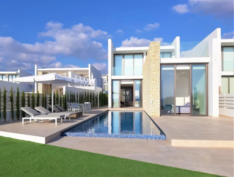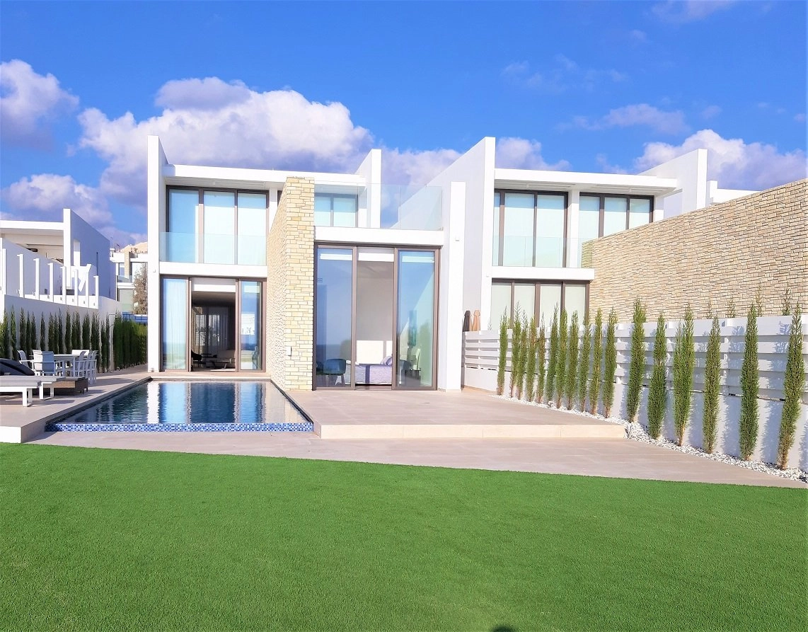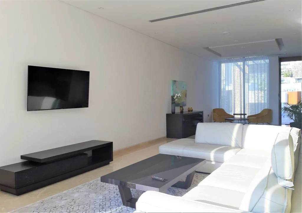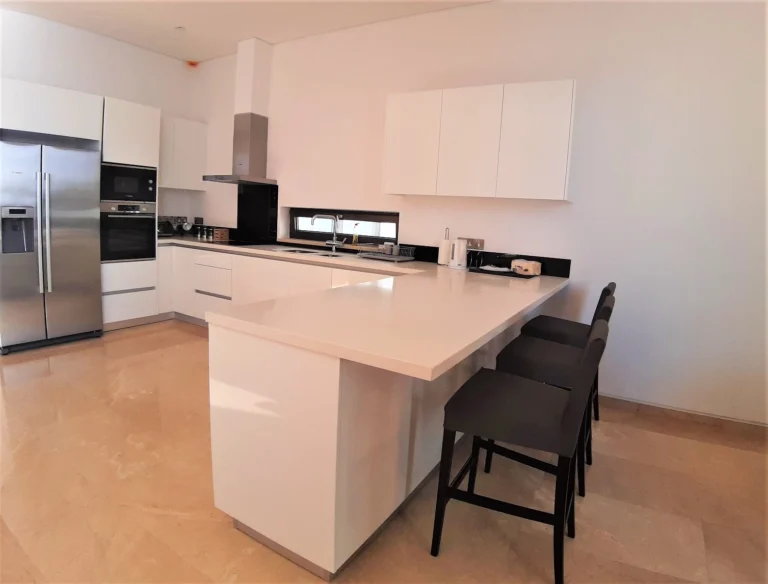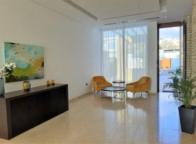 The ground level foyer leads to the open plan dinning room and living room and the guest bathroom which in turn leads to the fully equipped kitchen, family dinning and family living room. The wooden staircase embraces the glass elevator, servicing all three levels. The first floor level offers four bedrooms all with ensuite bathrooms, with the master bedroom boasting huge windows accentuating the amazing views to the Akamas peninsula from inside the room itself and also from the spacious balconies. The basement level has one bedroom with ensuite bathroom, guest bathroom, fully equipped kitchen and bar, cava with wine coolers, superb open plan entertainment area, cinema room, gym area, Jacuzzi tub, built in sauna, panic room and control room and a most impressive glass window looking directly into the deep end of the swimming pool above! The basement also leads to the double covered parking area.