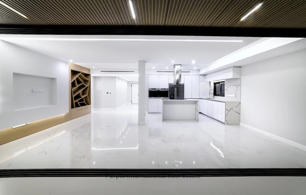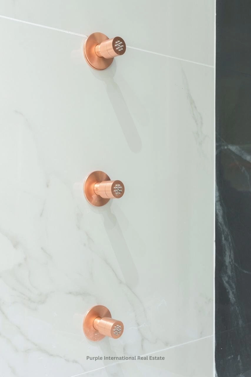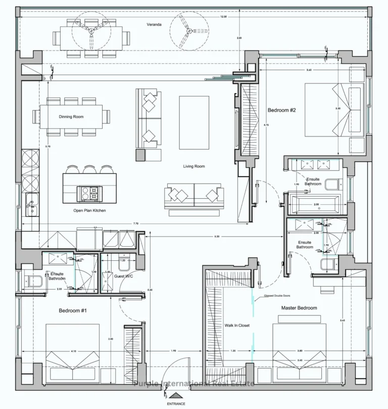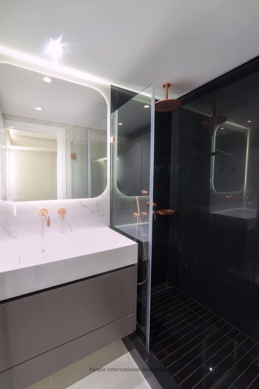 The apartment offers bespoke design, crafted with high end finishing such as marble, granite stones, real wood floors, open plan design kitchen and living room. Includes a guest wc, 1 master bedroom with en-suite bathroom and a large glazed walk-in closet, 2 additional double bedrooms with en-suite bathrooms, and a large outdoor veranda, accessed from the living room area via fully folding glazed doors.