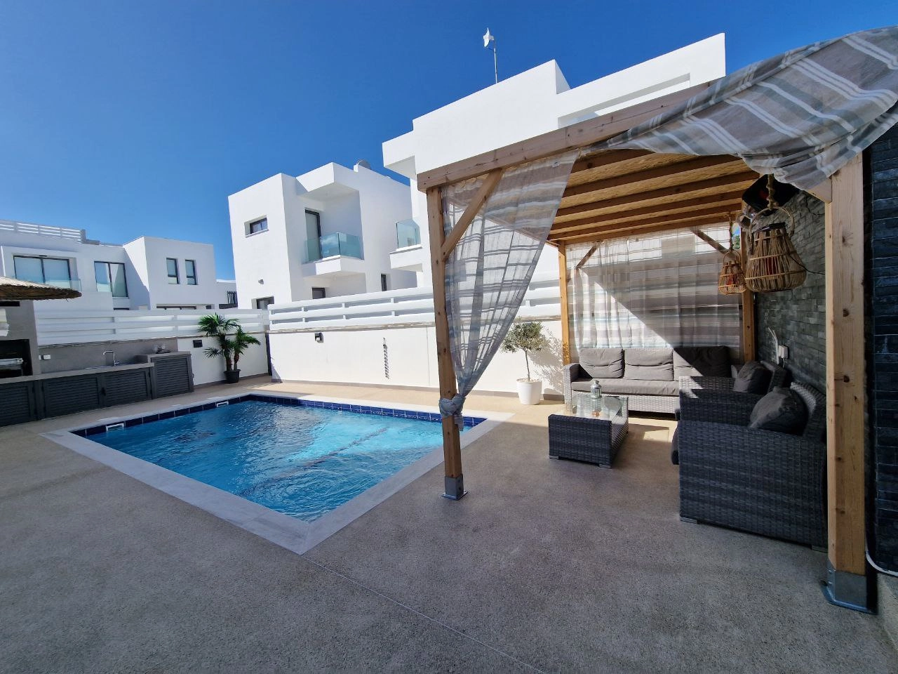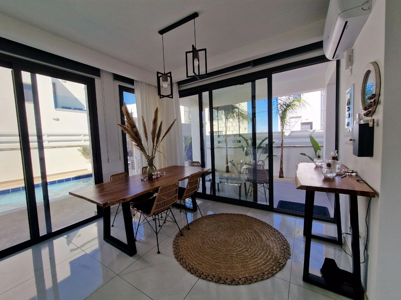 Rent a new 3 bedroom villa in Kapparis, 150 meters from the sea, with a private salt water pool. The villa is part of a new modern complex. It is equipped with photovoltaic panels, electric gates, a security system and video cameras. There is a barbecue area, a kiosk near the pool, covered parking and mosquito nets. The villa is fully furnished and equipped with everything necessary for a comfortable stay.