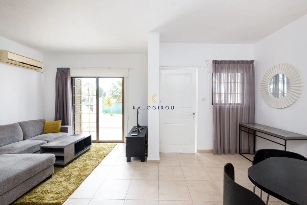 Apartment for rent in Oroklini Village. It consists of an open plan kitchen, dining, living area, a main bathroom, two bedrooms and spacious uncovered veranda. The apartment is fully furnished, equipped with electrical appliances and A/C.