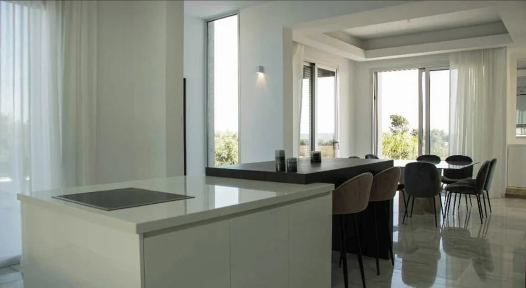 Inside, you will find a stylish open-plan living area equipped with a central AC system for year-round comfort and an elevator for easy access to all floors. Large windows and a south-facing orientation ensure the villa is bright and offers beautiful sea views. Energy efficiency is rated A, helping you keep your running costs low.