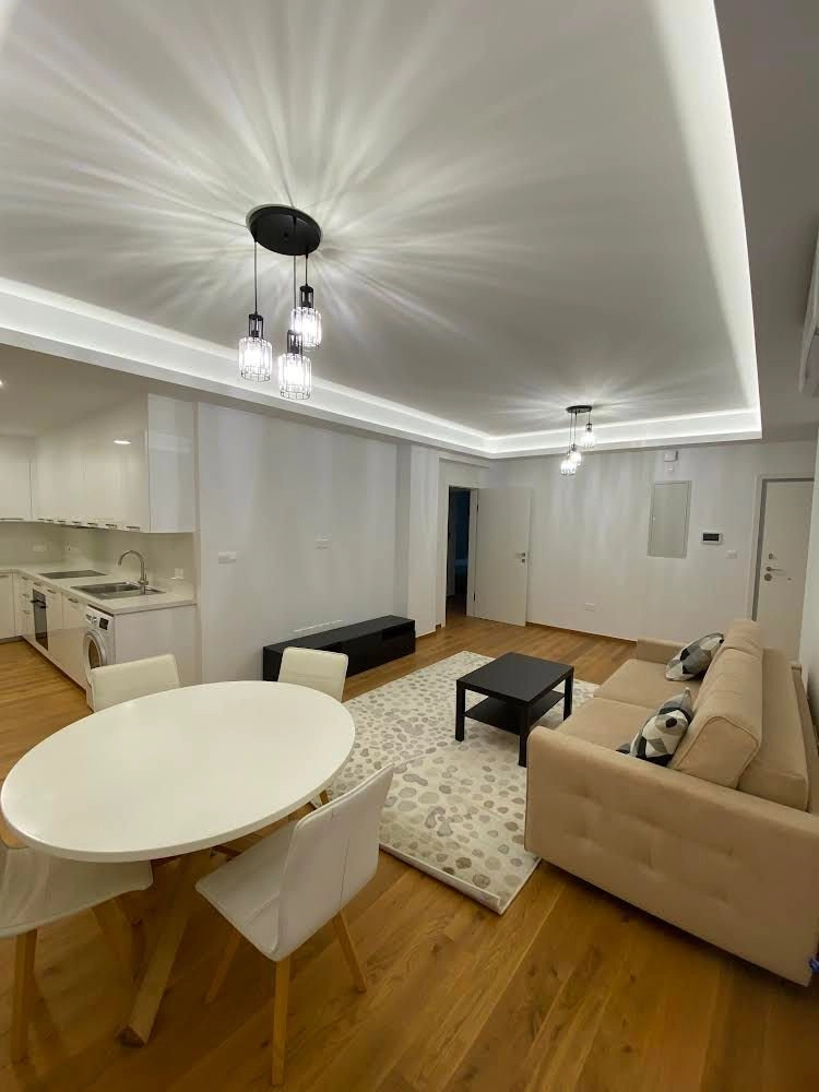 The apartment features a spacious open-plan layout, with a sleek, fully equipped kitchen that flows seamlessly into the bright living and dining areas. Large windows provide plenty of natural light, creating a warm and welcoming atmosphere.
