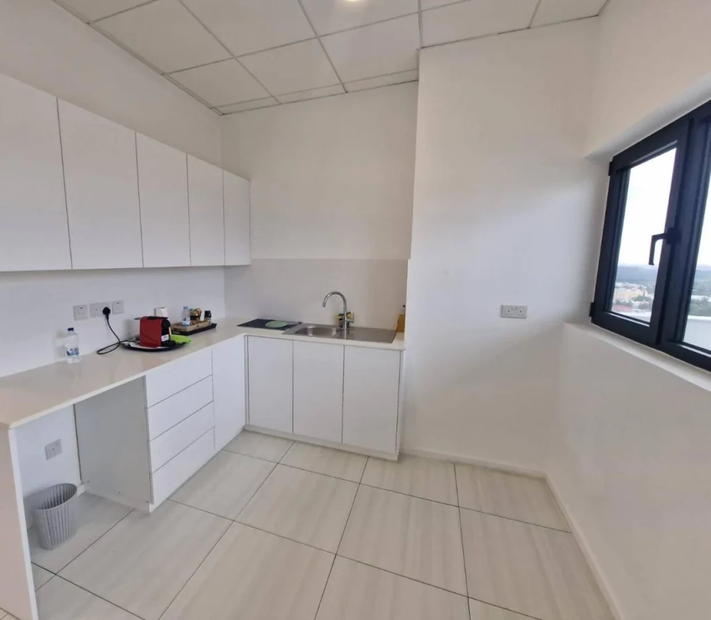 For rent whole open space (290 m2 of working space, plus 83 m2 of verandas) in a modern high-rise commercial complex located in the Dasoupolis area, on the main business avenue of the capital. The complex is the tallest and most modern office tower in Nicosia. From here it is easy to reach both the city center and the main highway. The business tower with an elegant attractive facade consists of 16 floors, including a ground floor with a mezzanine, a two-level underground parking for 133 parking spaces and a magnificent roof garden.