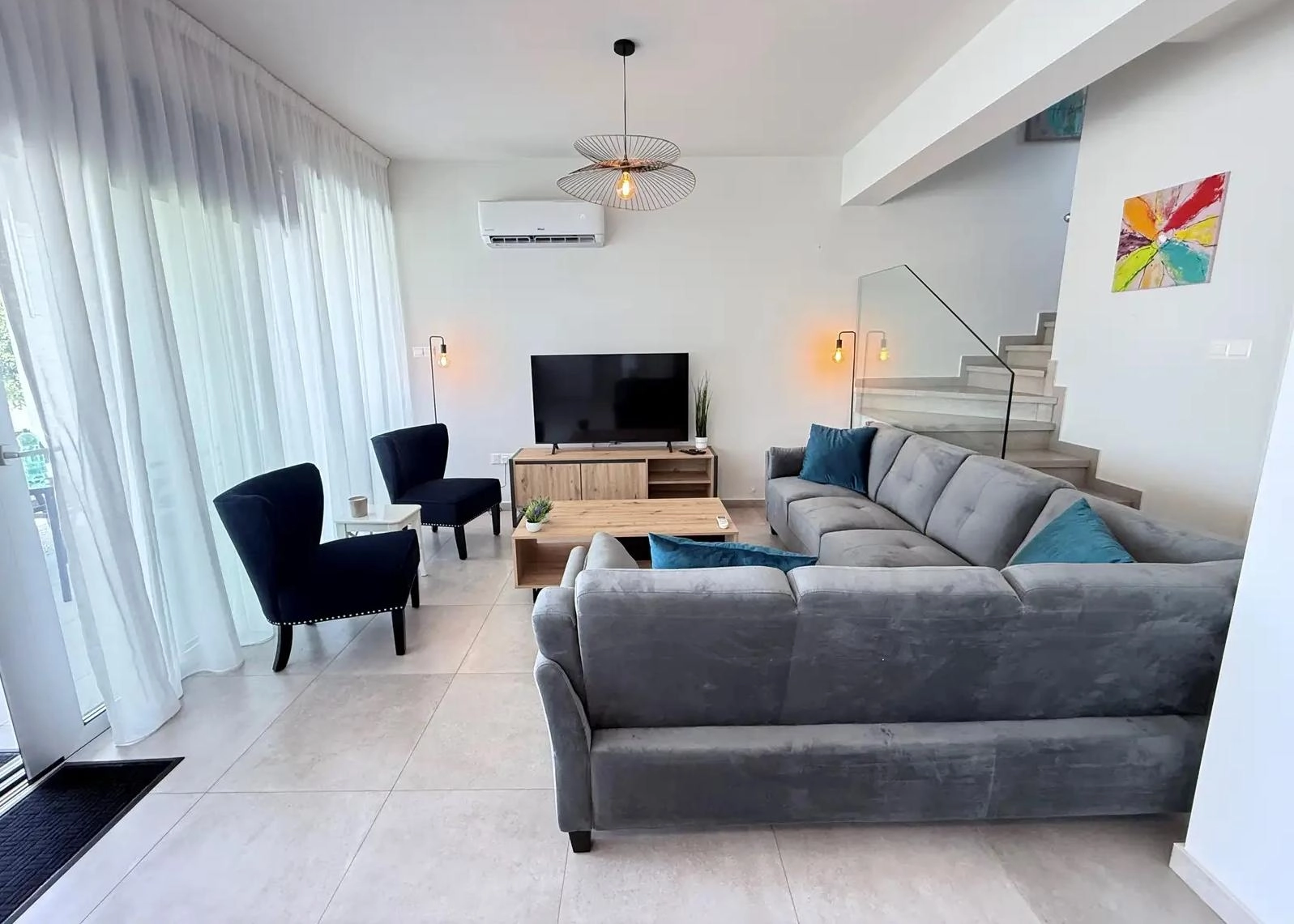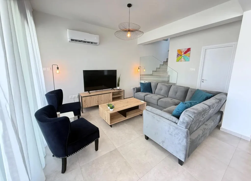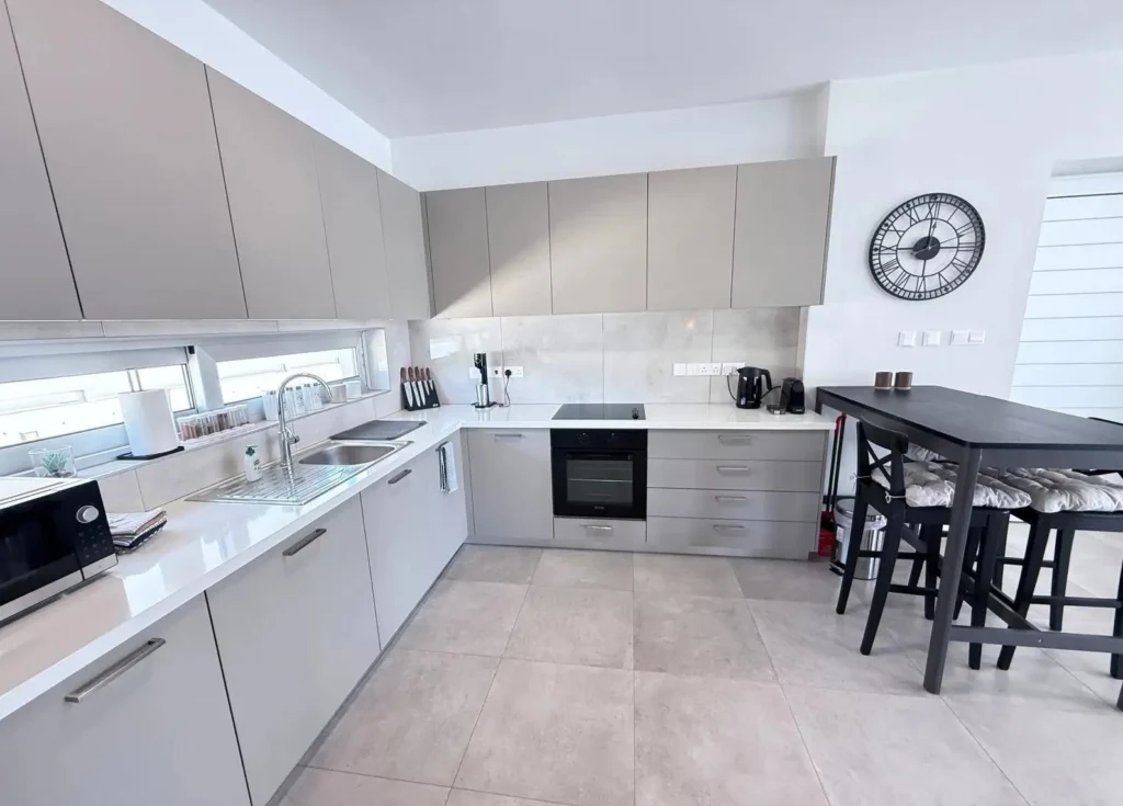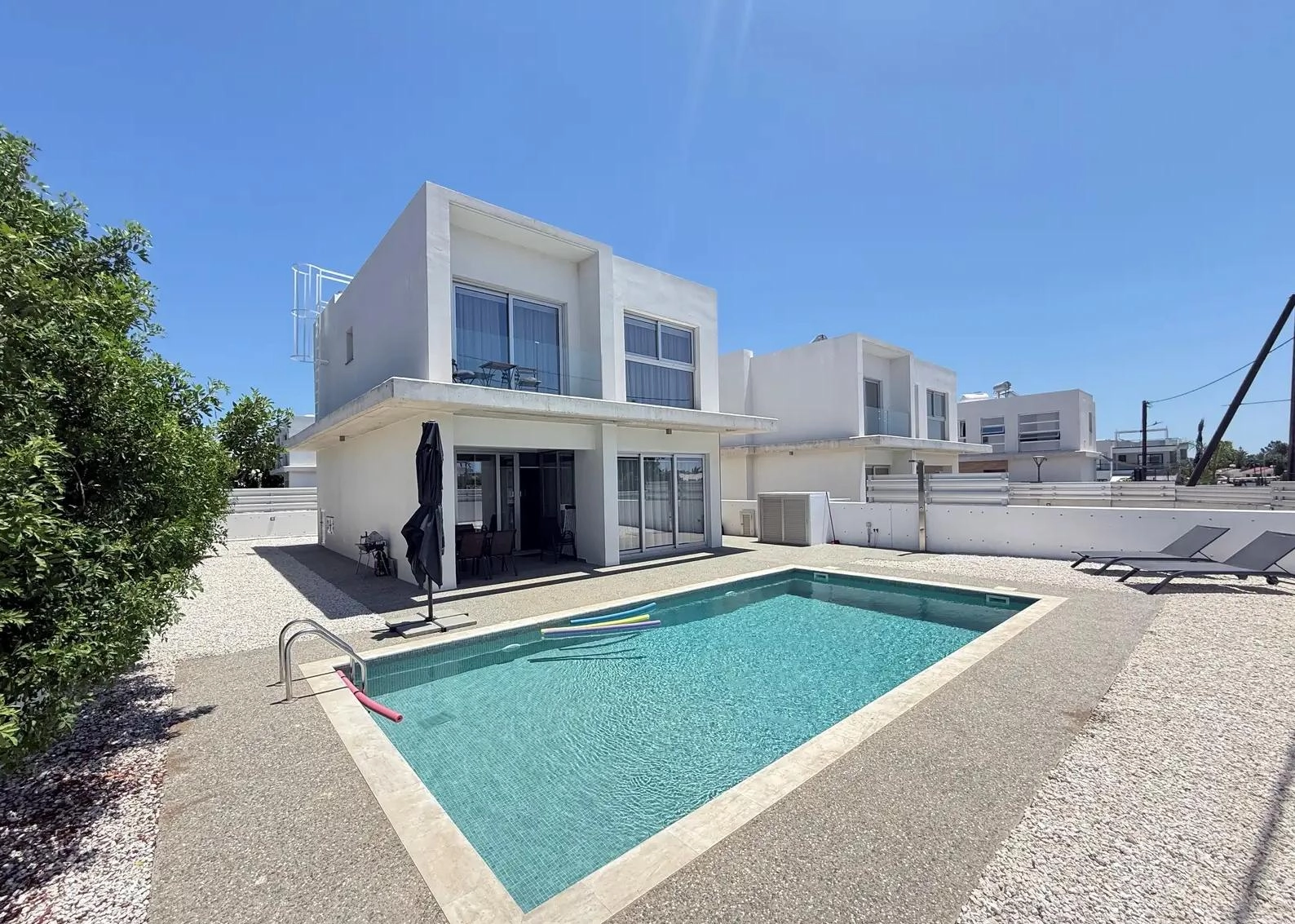 3-bedroom house of 145 m2 for rent in Kapparis, Famagusta. The house includes three bedrooms, three bathrooms with showers, a living room, a kitchen, a balcony, a storage room and a 340 m2 plot with a garden and a swimming pool. The villa is fully furnished with modern furniture and equipped with household appliances, air conditioners are installed in all rooms, and outdoor parking is provided. The property was built in 2022, has a high energy efficiency class A and has a spacious, bright layout. Outside there is a private swimming pool with a relaxation area and panoramic views of the surroundings, as well as a cozy garden. The house is located next to all necessary infrastructure — shops, restaurants and services. The popular Kapparis area is known for its peaceful atmosphere and beautiful surroundings, making this residence an excellent choice for permanent residence or long-term rental.