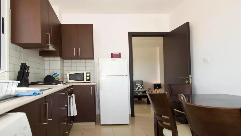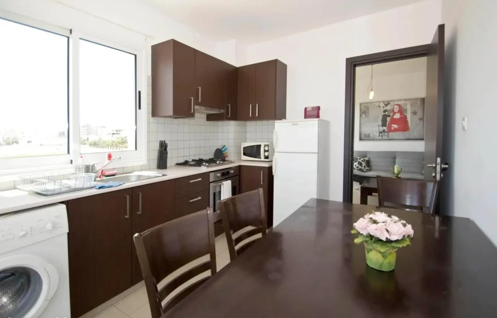 Two-bedroom apartment of 80 m2 for rent in Omonia, Limassol. The apartment includes two bedrooms, one bathroom, a spacious living room, a modern kitchen, a balcony and a pantry. The apartments are fully furnished and equipped with all necessary household appliances: a new 65’ Smart TV, refrigerator, microwave, toaster, oven and extractor hood. Each bedroom and living room has air conditioning. There is a covered parking space and a large storage room. The building was built in 2011, is equipped with an elevator and is located in a quiet residential area next to a park and a green area. Sklavenitis supermarket, Bank of Cyprus, New York Sweets bakery, cafes, shops, butcher shop and fresh produce market are within walking distance. Only 5 minutes by car to My Mall, Cyprus Casino and Ladies’ Mile Beach. Convenient access to the main roads and excellent transport links. After a recent major renovation, the apartment has modern finishes, laminate floors in the bedrooms and tiles in the kitchen and bathroom.