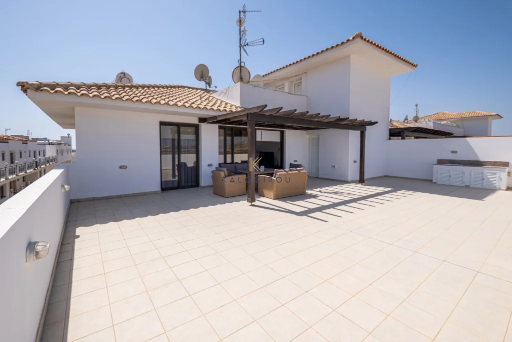 Second floor apartment for rent in Tersefanou area. The apartment is fully furnished, equipped with electric appliances and a/c. Itconsists of an open plan kitchen, living, dining area, two bedrooms, en suite shower & wc in the master bedroom, a main bathroom and large roof garden. Enclosed area of the apartment is 72 sqm and roof garden is 97 sqm. In addition, the residents have access to a parking spot and to the complex’s communal swimming pool.