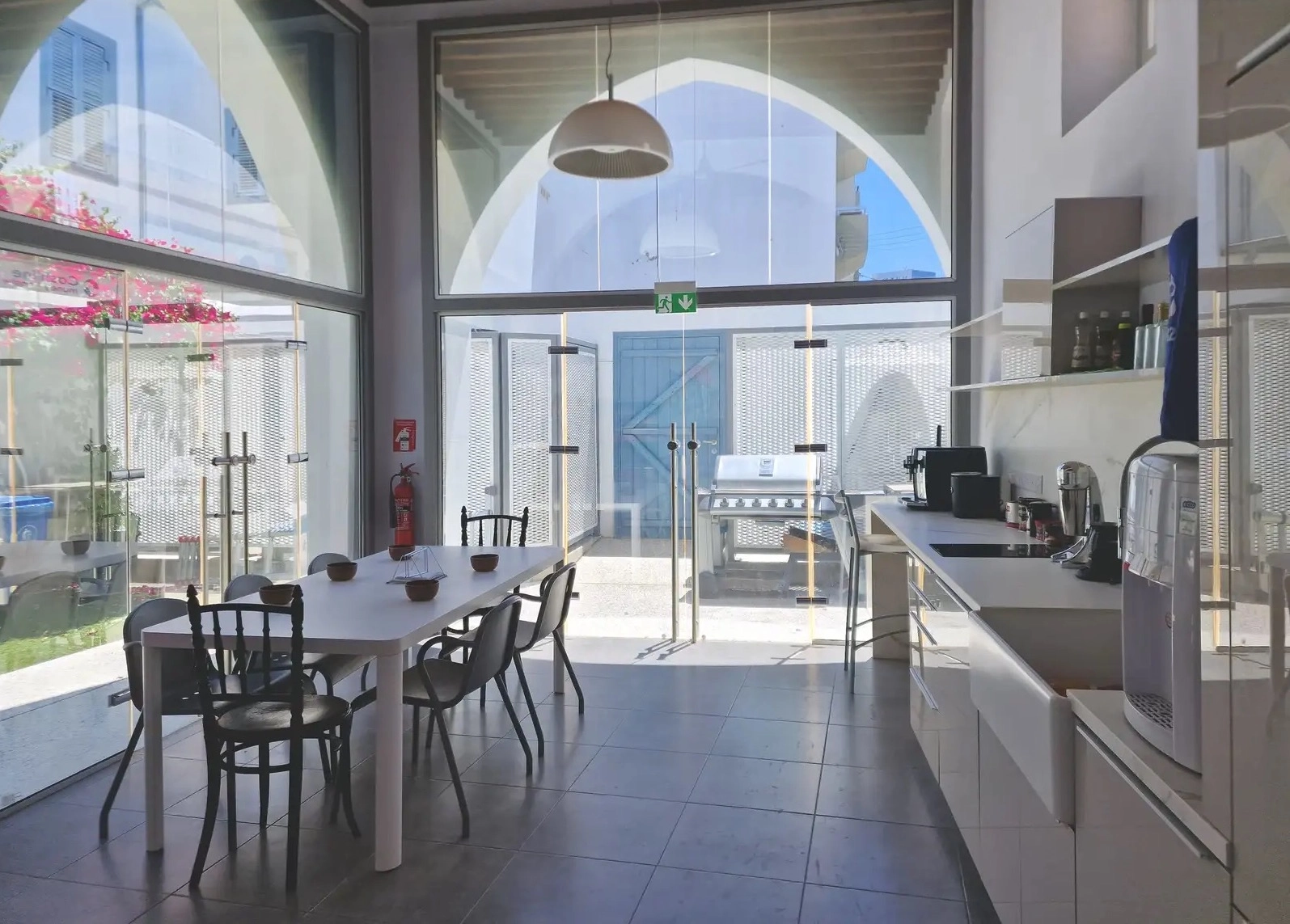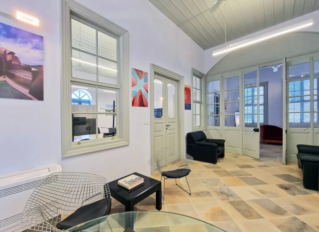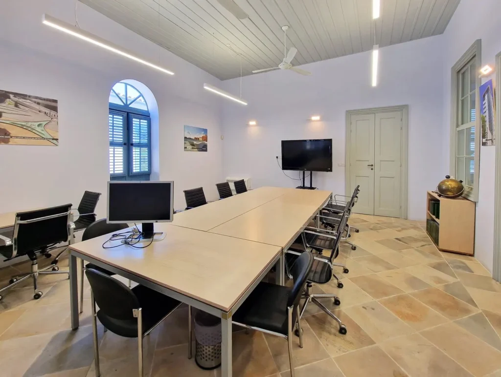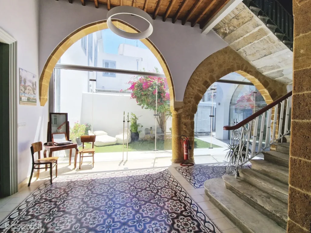An office building with an area of 444 m2 in the Walled Old City area, Nicosia, is for rent. It is a unique historical site consisting of two levels, located just a few minutes walk from Ledra Street. The building includes: two spacious offices on the ground floor (each 32 m2) with majestic sandstone arches, suitable for 4-5 workplaces each; five offices on the upper floor (approximately 20 m2 each), designed for 2-4 people; a conference room (37 m2) with two TVs for presentations and meetings; a kitchen on the ground floor with a refrigerator, a coffee machine and a seating area, as well as a kitchenette on the second floor; three bathrooms on the first floor, including a bathroom for disabled visitors, and two bathrooms on the second floor; a shower room and a washbasin on the first floor; a marble staircase and a patio. The building is fully furnished with stylish office furniture in excellent condition and equipped with all necessary appliances — a printer, a copier and Wi-Fi. Tenants are given the opportunity to rent both a separate office and the entire building.