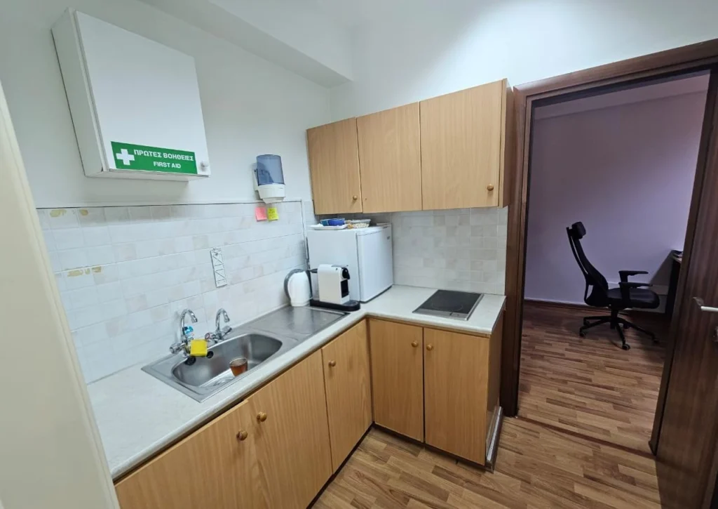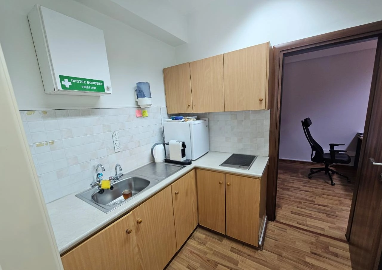 Office for rent with an area of 95 m2 on the third floor in the area of Town Center Paphos, Paphos. The office includes three separate work spaces, which makes it an ideal option for a team of specialists or a company hosting clients. The room is equipped with a kitchen and a bathroom, one parking space is provided, and there is also the possibility of using an underground parking. The building is located in the central part of the city, next to the municipality, with convenient access to the entire urban infrastructure.