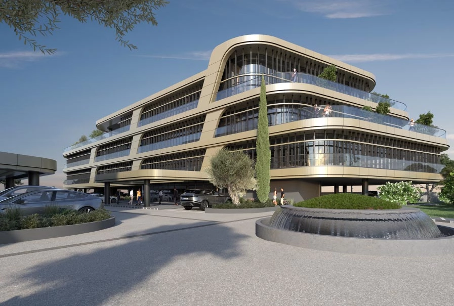 An office building for rent in an innovative complex located in Limassol, in the Potamos Germasogeia area. The internal area of the building is 4000m2, the total area is 6000m2. The building has 50 covered parking spaces. It is a modern design that includes two office buildings with three floors, symmetrically located along the central axial alley. The office spaces in these buildings are designed with open plans, which provides maximum flexibility, allowing you to easily adapt the spaces for both single and multiple use. The project offers a total covered area of 8000 m2, providing a modern and versatile working environment.
