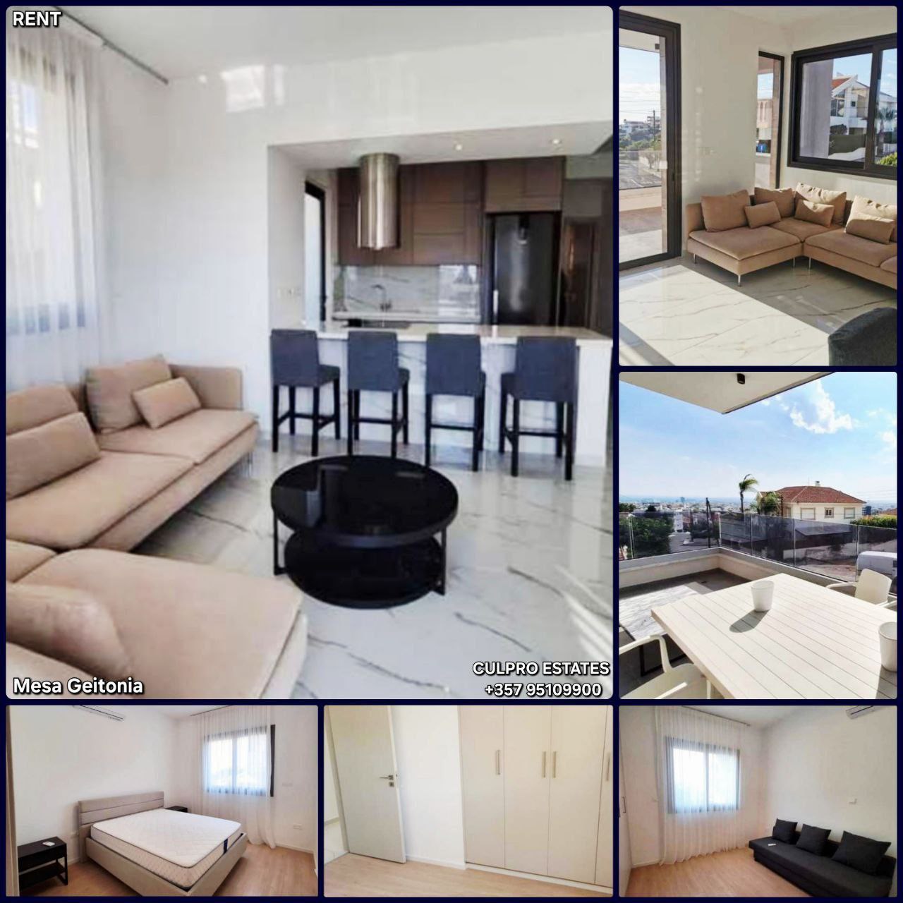Rent Available for occupancy from mid-November 2025, can be viewed 2 bedroom apartments with sea view in Mesa Geitonia area beyond the highway, Limassol. All infrastructure and beach within 7 minutes drive, not far from Upstairs Math’s Education. 1st floor Area: 90 sq m Kitchen Living room 2 bedrooms Shower room + guest toilet Veranda: 18 sq m Electric blinds in bedrooms Storage room Covered parking Year built: 2021 Pets allowed Price: 1,850 Agency CULPRO ESTATES Ltd L.N 197/E R.N 1189 +357 95109900 +357 95592209