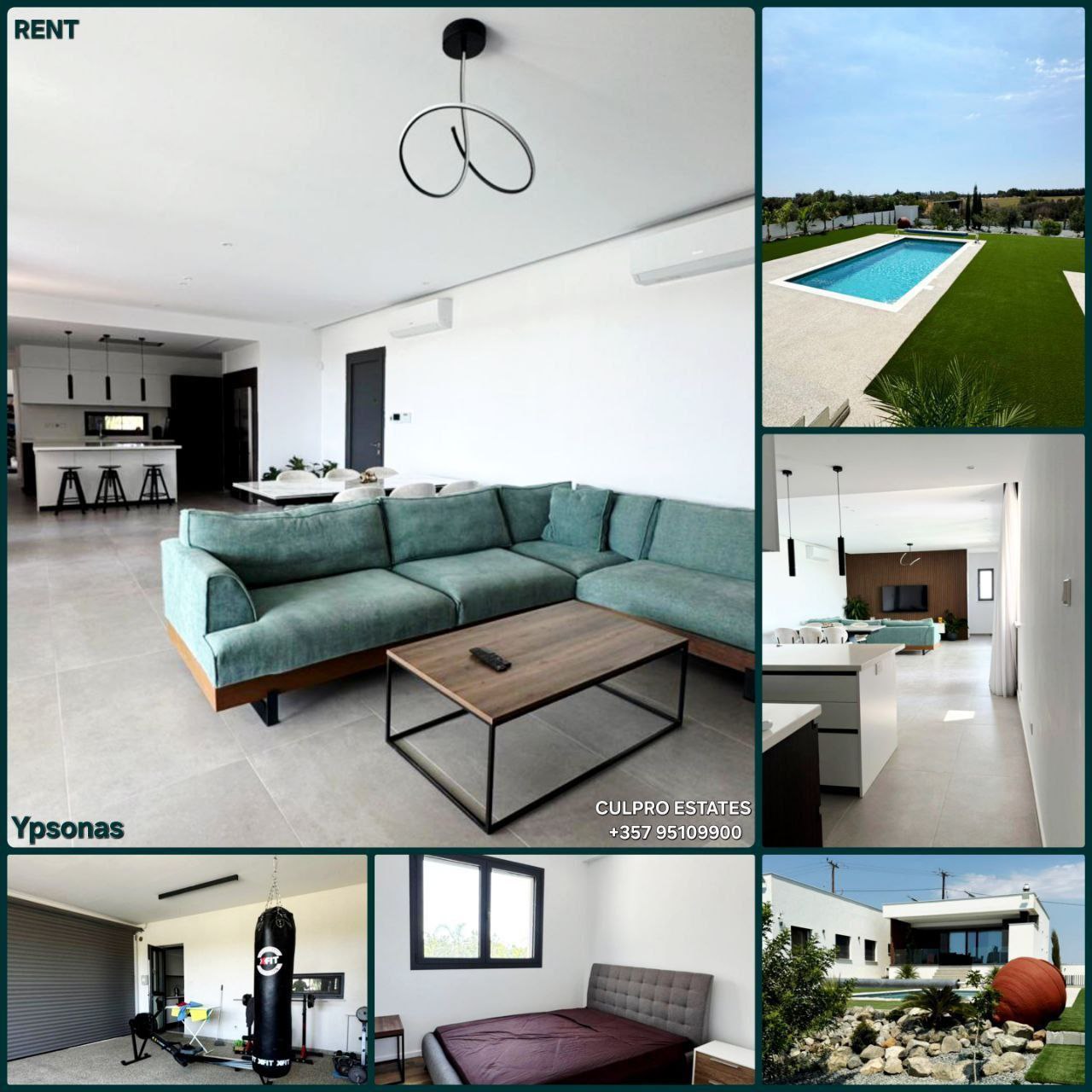 Rent Modern 4 bedroom villa with pool in Ypsonas, 15 minutes from Limassol. Living area: 260 sq m Plot area: 1,400 sq m 2 fully equipped Italian kitchens with granite countertops Dining area Living room 4 bedrooms Bathrooms Verandas Heating + AC Laundry room Pantry Garden Pool Gym Electric gates Alarm Garage for 2 cars + extra open plan parking Photovoltaics electricity bills will be inexpensive Price: 5,000 Agency CULPRO Estates Ltd L.N 197/E R.N 1189 +357 95109900 +357 95592209