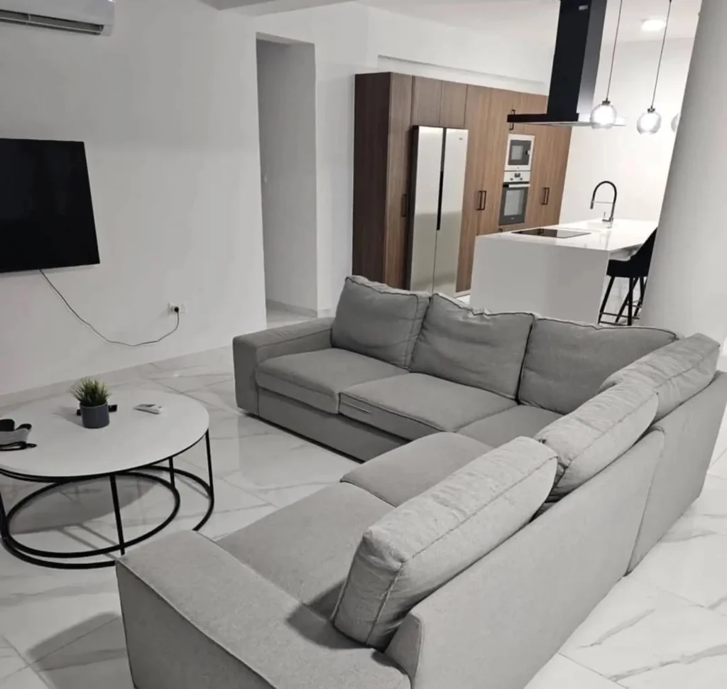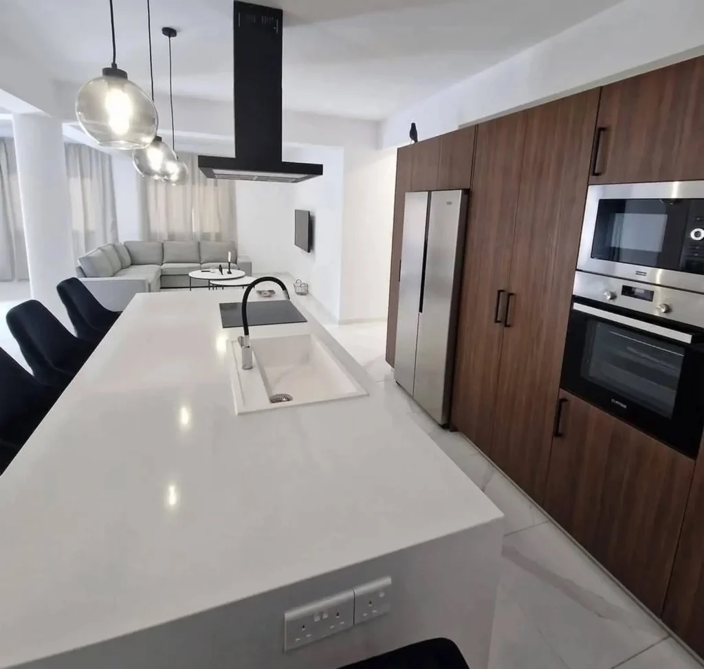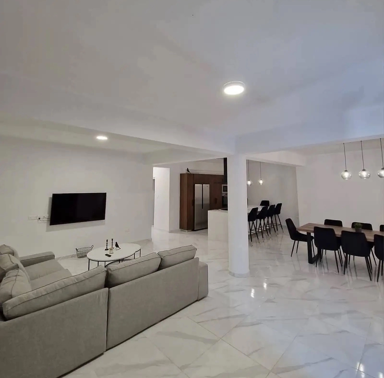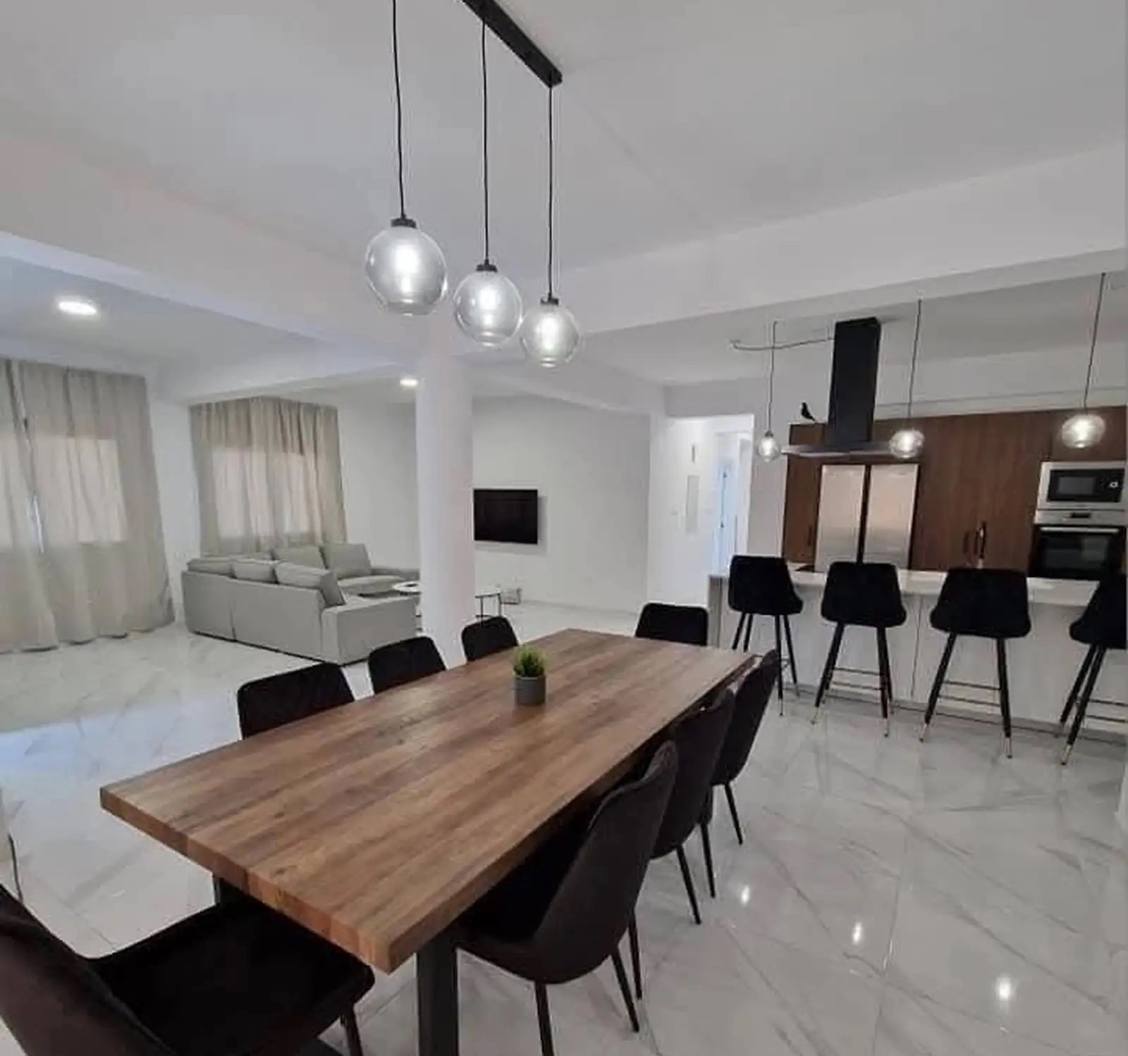 For rent a two-storey 4-bedroom house with an area of 200 m2 in the area of Theletra, Paphos. The house includes a spacious living room, an open kitchen, four bedrooms, three bathrooms, an additional kitchen, an office desk, balconies and a basement of 100 m2. The master bedroom is equipped with a 32-inch Smart TV and a private bathroom. The property is fully furnished and equipped with modern appliances: a new Side-by-Side refrigerator, a washing machine, a 55-inch Smart TV, a corner sofa, air conditioners in all rooms and electric heaters. There are 5 beds in the house. There is a wood-burning stove. The plot has a garden and a large covered parking. The house is located in a quiet and picturesque area with friendly neighbors, just a 2-minute drive from supermarkets, restaurants, taverns and gas stations. The center of Paphos is 15-20 minutes away, and Latsi Beach is about 10 minutes away.