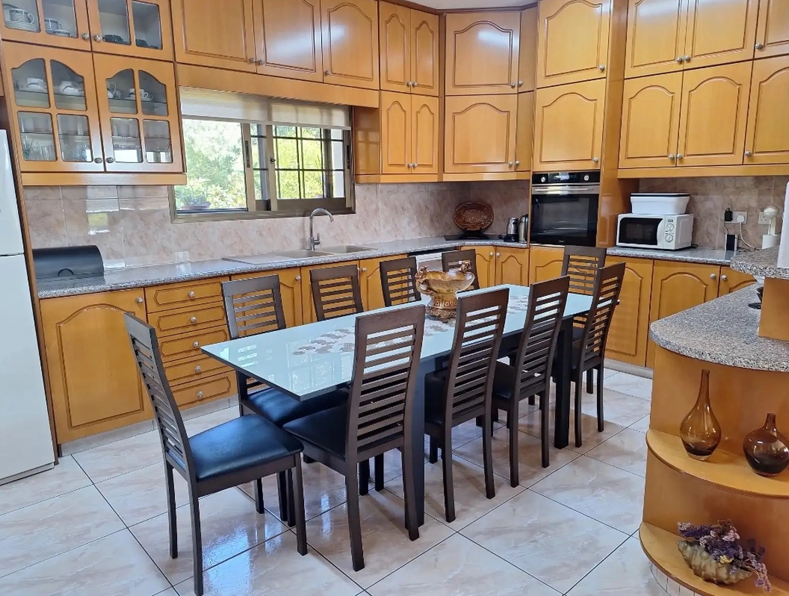 Two-storey house of 210 m2 for rent in the area of Mesa Chorio, Paphos. The house includes a spacious living room, a separate dining room, a fully equipped kitchen, a laundry room, a guest bathroom on the ground floor, as well as four bedrooms on the ground floor. The master bedroom has a private bathroom with a shower, while the other three have a shared bathroom and a separate toilet. There is also a small additional kitchen on the floor. The property is fully furnished, equipped with air conditioning in all rooms, fireplace, alarm system and storage room. There is a well-kept garden, balconies and covered parking. The house is built on a plot of 360 m2, located in a picturesque and dry area with a wonderful climate without humidity, provides complete privacy and offers a magnificent panoramic view. Only 3 minutes drive from the International School of Paphos.