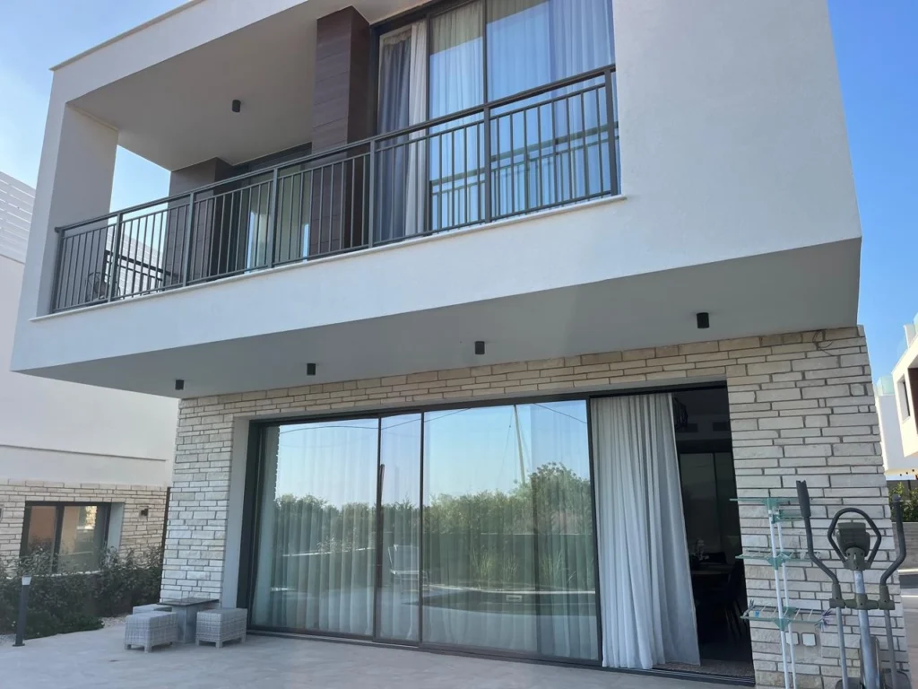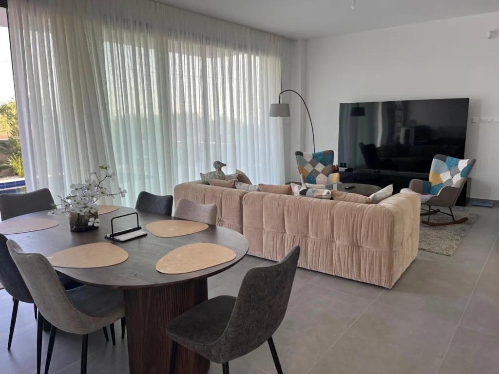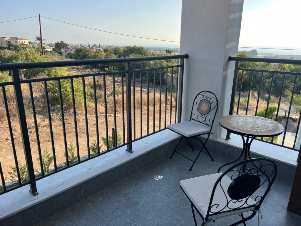 For rent a modern 3-bedroom villa of 180 m2 in the area of Empa, Paphos. The villa is designed in a modern architectural style and includes 3 bedrooms, a spacious living room, a fully equipped kitchen, bathrooms and storage areas. The property is fully furnished and equipped with Bosch appliances, VRV air conditioning, underfloor heating, 5 kW photovoltaic system, alarm system and 100-inch Smart TV. The plot has a 3.5×7 m swimming pool, a well-maintained garden with a barbecue area and a magnificent panoramic view of the sea. The villa is located in a gated, well—maintained complex on a hill in a quiet location, away from other residential developments.
