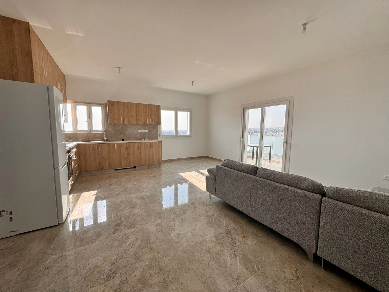 Open-plan living area with a fully equipped modern kitchen