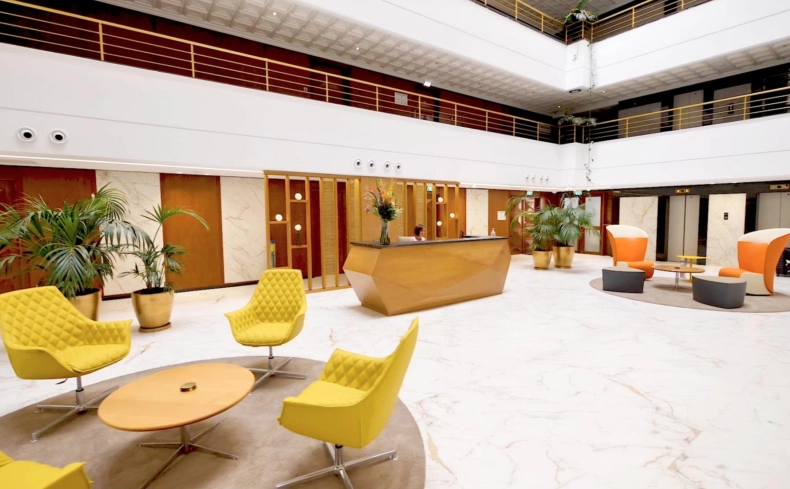 The building provides exceptional amenities such as a main reception area, mail sorting and delivery, camera surveillance of entrances and common areas, and four high-speed elevators connecting all seven floors. Tenants benefit from guest waiting areas, maintenance and cleaning services,