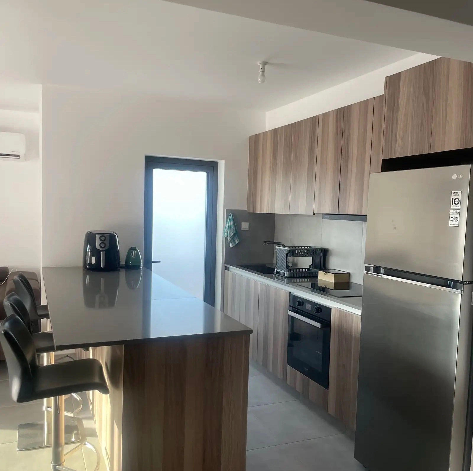 Two-bedroom apartment of 98 m2 for rent in the area of Aradippou – Agios Fanourios, the city of Larnaca. The apartment is located on the 1st floor of a modern house built in 2023 and includes 2 bedrooms, 2 bathrooms with showers, an open kitchen, a living room and 2 covered verandas. The apartments are fully furnished and equipped with all necessary household appliances, as well as air conditioning in all rooms. The building has an elevator, covered parking and a storage room. The property has a high energy efficiency class A and is located in a quiet residential area of Aradippou with convenient access to the city’s infrastructure.