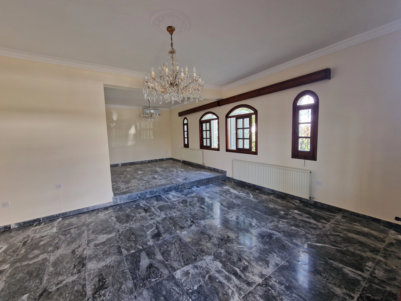 Five-bedroom house for rent in Aglantzia, Nicosia. The total area of the house is 350 m2, the plot is 550 m2. The house is newly renovated, partially furnished (appliances only), fully equipped with air conditioning and central heating. On the main level there are three bedrooms, a bright living room with a fireplace, a separate large kitchen with a second fireplace, an additional sitting area and direct access to the veranda and garden. In the basement there are two more bedrooms that can be used as an office, guest rooms, a game room or staff rooms. The house has three bathrooms: a main bathroom, a guest toilet and a toilet with a shower. Outside there is a large front porch, an enclosed veranda by the kitchen, a private garden, a garage with gates, as well as covered and outdoor parking. The house is located on a quiet residential street near supermarkets, parks, university and main roads.