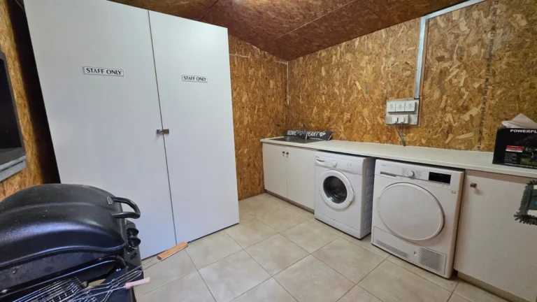 The property offers 80 sq.m. of covered living space, a 10 sq.m. covered pergola, and a spacious 80 sq.m. private yard with a landscaped garden. It also includes an outdoor utility room with a washing machine and storage space.