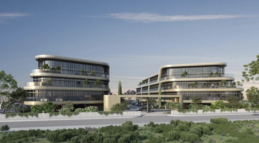 An office building for rent in an innovative complex located in Limassol, in the Potamos Germasogeia area. It is a modern design that includes two office buildings with three floors, symmetrically located along the central axial alley. The office spaces in these buildings are designed with open plans, which provides maximum flexibility, allowing you to easily adapt the spaces for both single and multiple use. The project offers a total covered area of 8000 m2, providing a modern and versatile working environment.