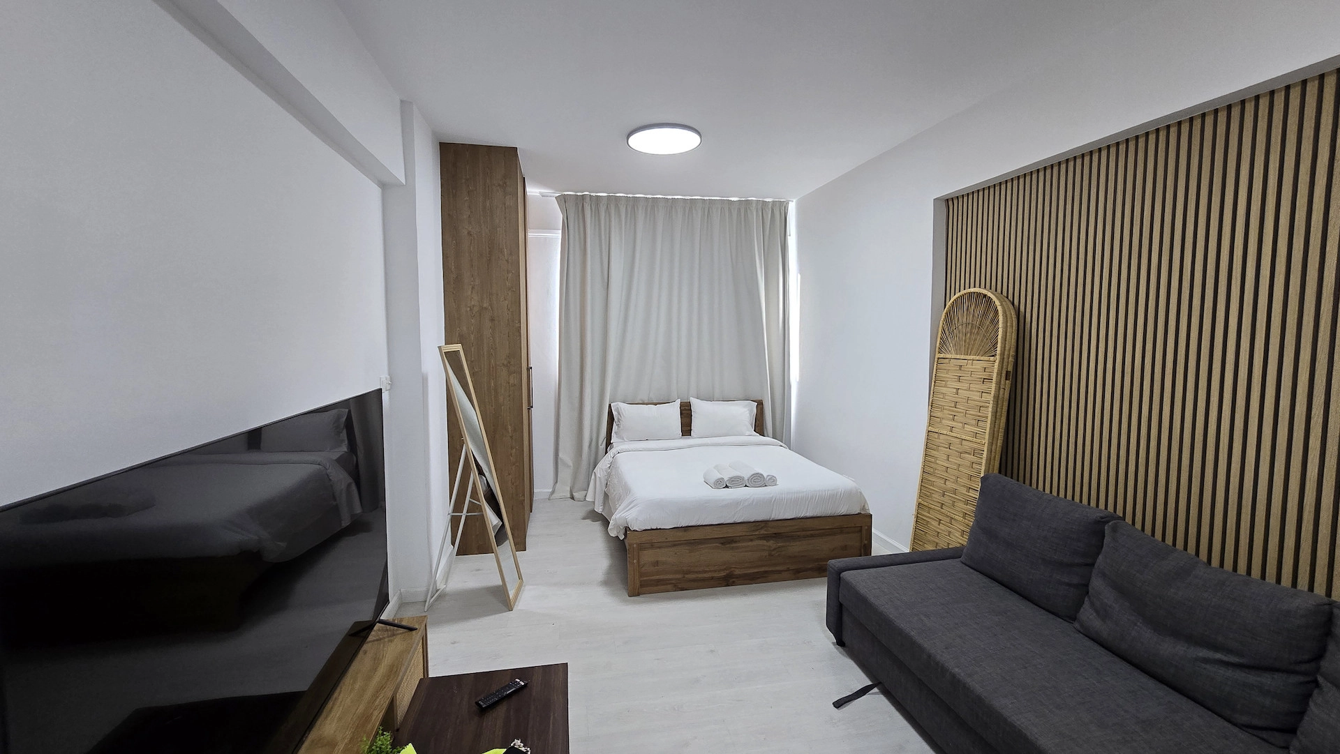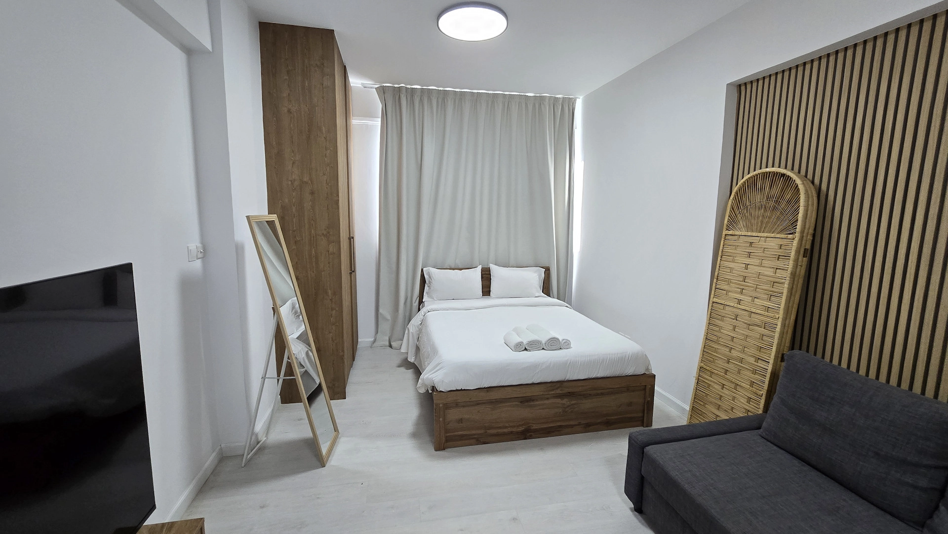 The apartment includes one stylish bathroom, designed with quality fixtures for your comfort. Enjoy year-round comfort with a central air conditioning system, ensuring the perfect indoor climate at all times. Large windows let in plenty of natural light, creating an inviting atmosphere.