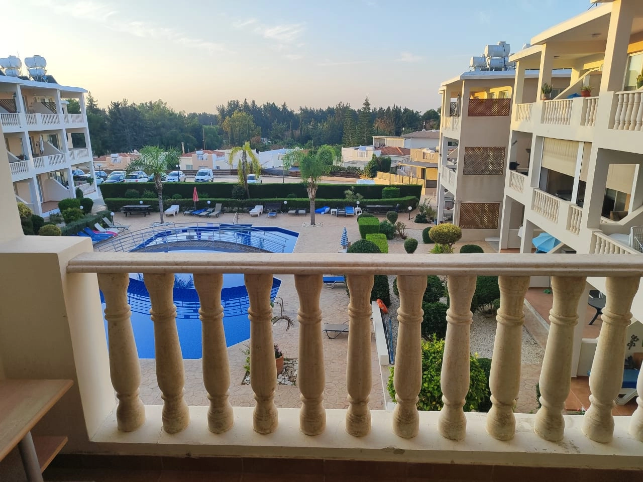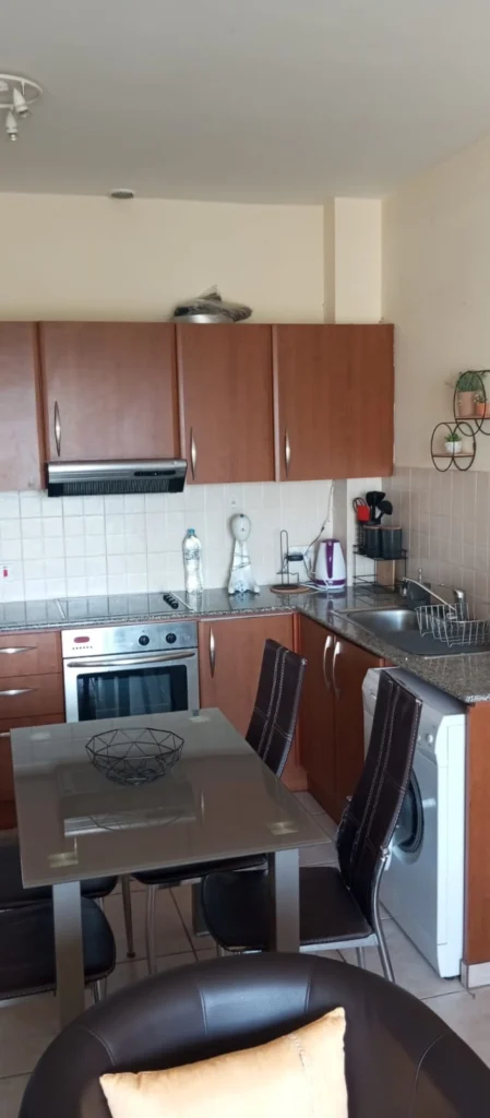 The apartment features one spacious bathroom, a bright living area, and a fully equipped kitchen. Large windows create a light and airy feel throughout the space. Residents also have access to a communal swimming pool, perfect for relaxing or socializing with neighbors.
