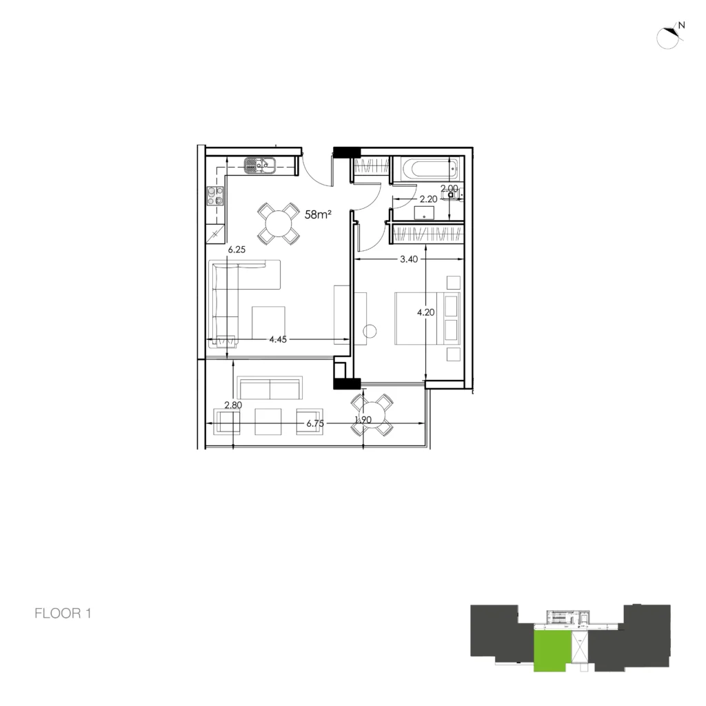 ✔ Indoor area: 58 m²