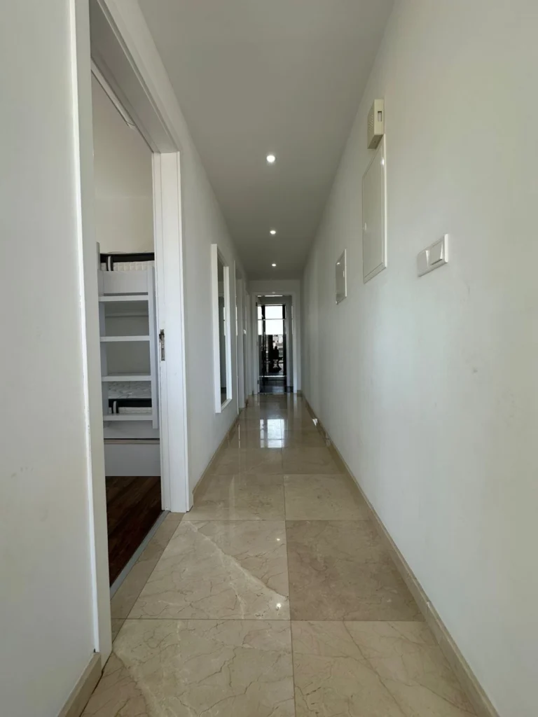 This apartment offers generous living space with three well-sized bedrooms, including a master bedroom with an en-suite bathroom featuring a bathtub. The second bathroom includes a shower, offering convenience for the other bedrooms. The spacious living room opens onto the large covered veranda, ideal for outdoor dining or simply enjoying the Mediterranean breeze.