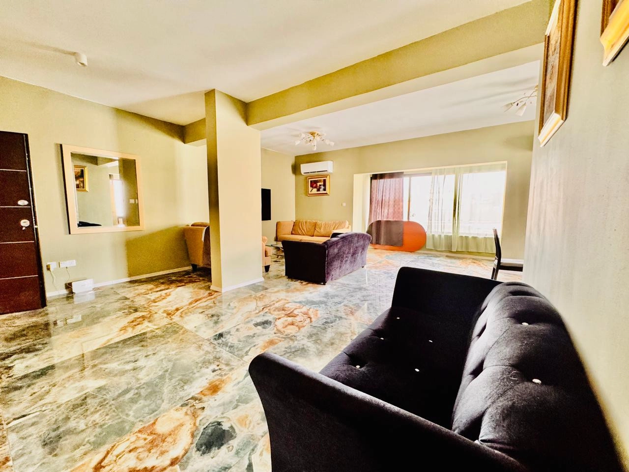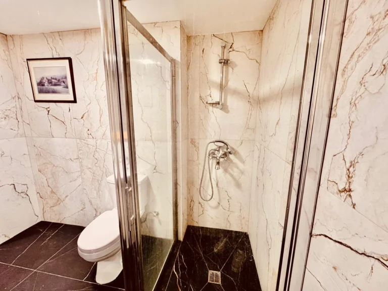 Originally built in 1998 and fully updated in 2024, the apartment blends contemporary style with practical functionality. The open-plan living and dining area features elegant marble tile flooring, stylish furniture, a TV lounge, and large windows that fill the space with natural light. All windows are soundproof, ensuring peace and quiet despite the central location.