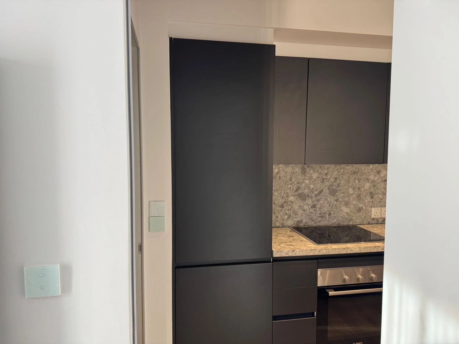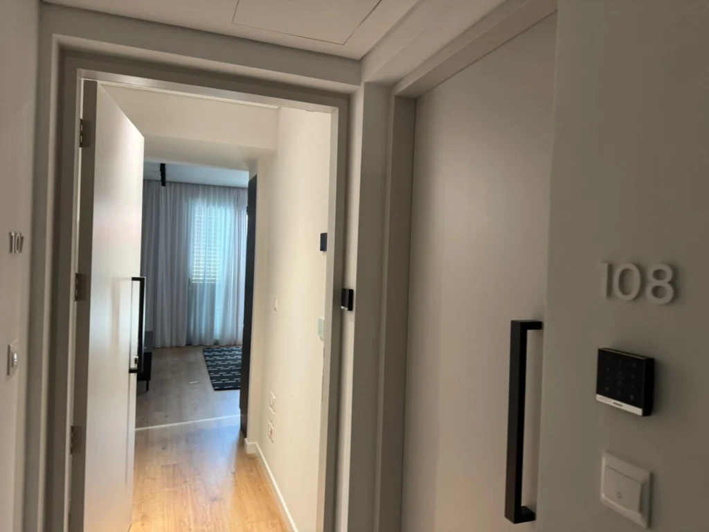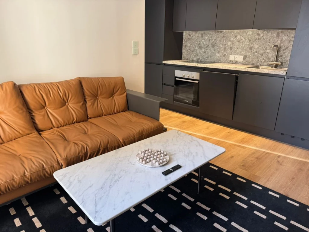 Inside, the apartment boasts a beautifully crafted interior with a modern open-plan kitchen, sleek dark cabinetry, quality appliances, and a stylish stone backsplash. The living area is warm and inviting, complemented by wood-effect flooring and high-quality materials throughout. Large windows bring in natural light, creating a bright and serene atmosphere.