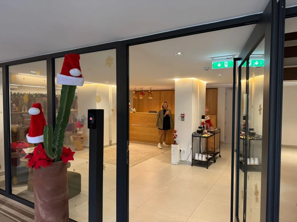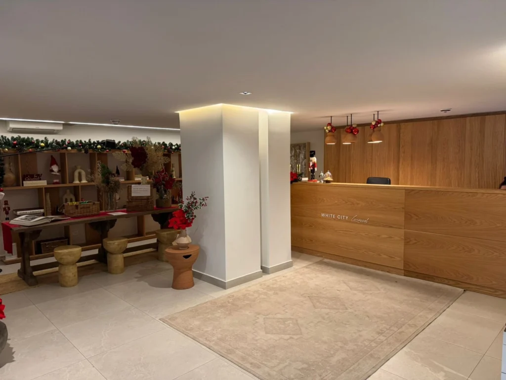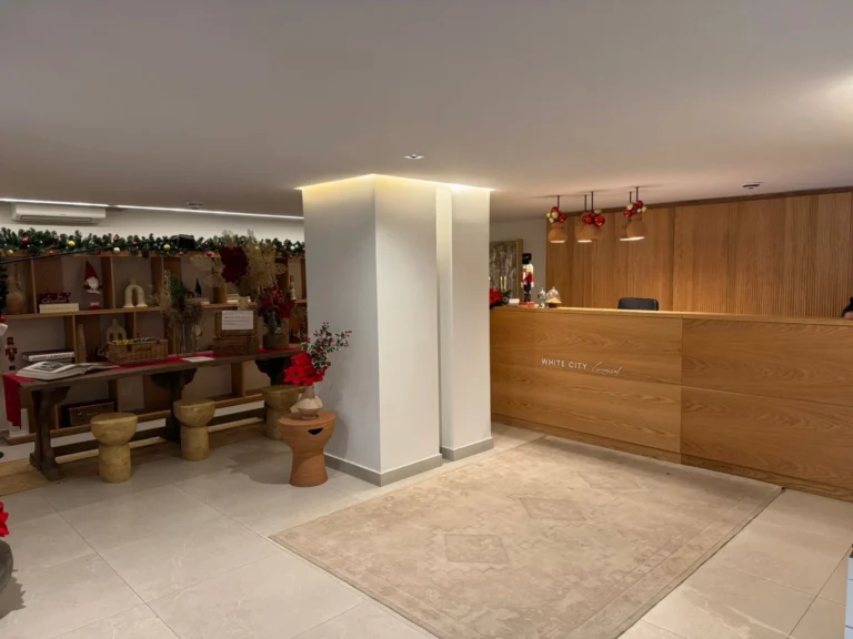 The exterior features clean lines, spacious balconies with glass railings, and sophisticated design details, creating a truly impressive presence. At the entrance, a welcoming concierge area enhances both security and luxury—perfect for residents who value high-standard living.