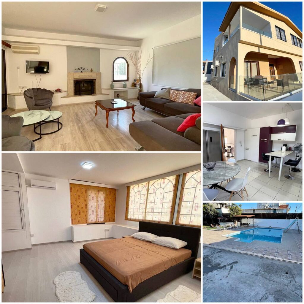 4579 RENT Limassol House 400m2 Location: Zakaki Plot area 1100m2 8 bedrooms 3 bathrooms (has a bathtub) Air conditioners Fireplace Photovoltaics Balcony Separate kitchen Swimming pool Parking Available from January 1st Price 7000€ 2 deposits LN56,RN186