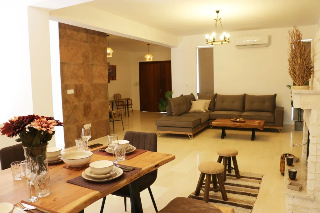 For rent a two-bedroom house with an area of 200 m2 on a plot of 7300 m2 in the area of Arodes, Paphos. The bungalow includes three bedrooms, three bathrooms, a separate living room, a kitchen, a fireplace, a well-kept garden, a spacious landscaped plot and a roof terrace of 100 m2. The property is fully furnished, equipped with air conditioning in all rooms, fireplace, security system and offers a high level of privacy. The house is located in a secluded, peaceful area with a full sense of privacy, while there is a private swimming pool and an equipped barbecue area. The year of construction is 2021.