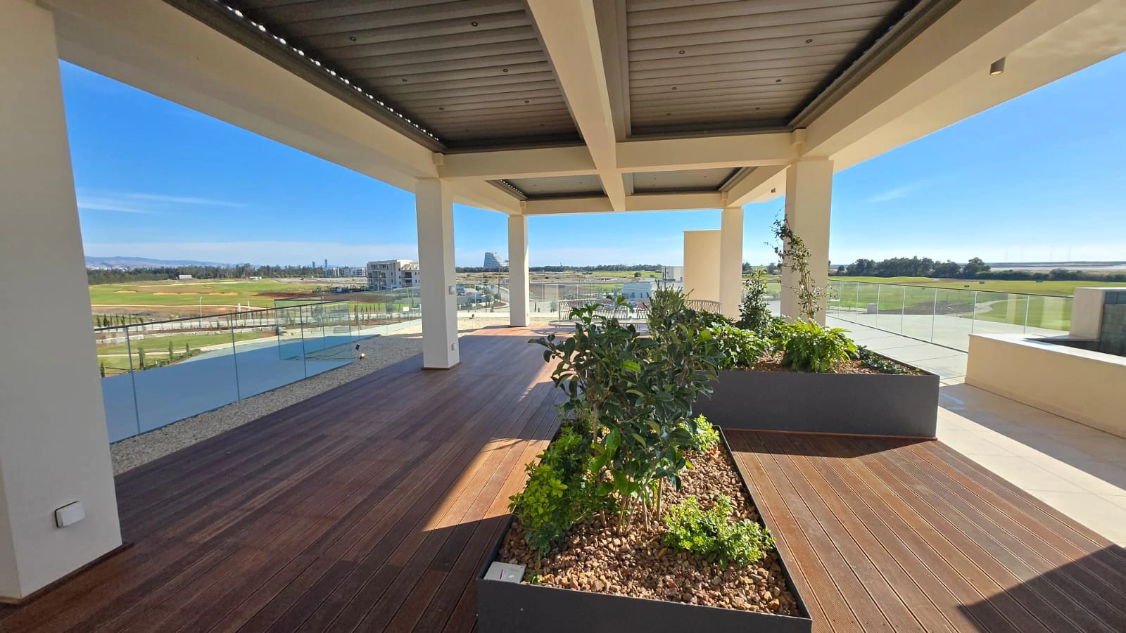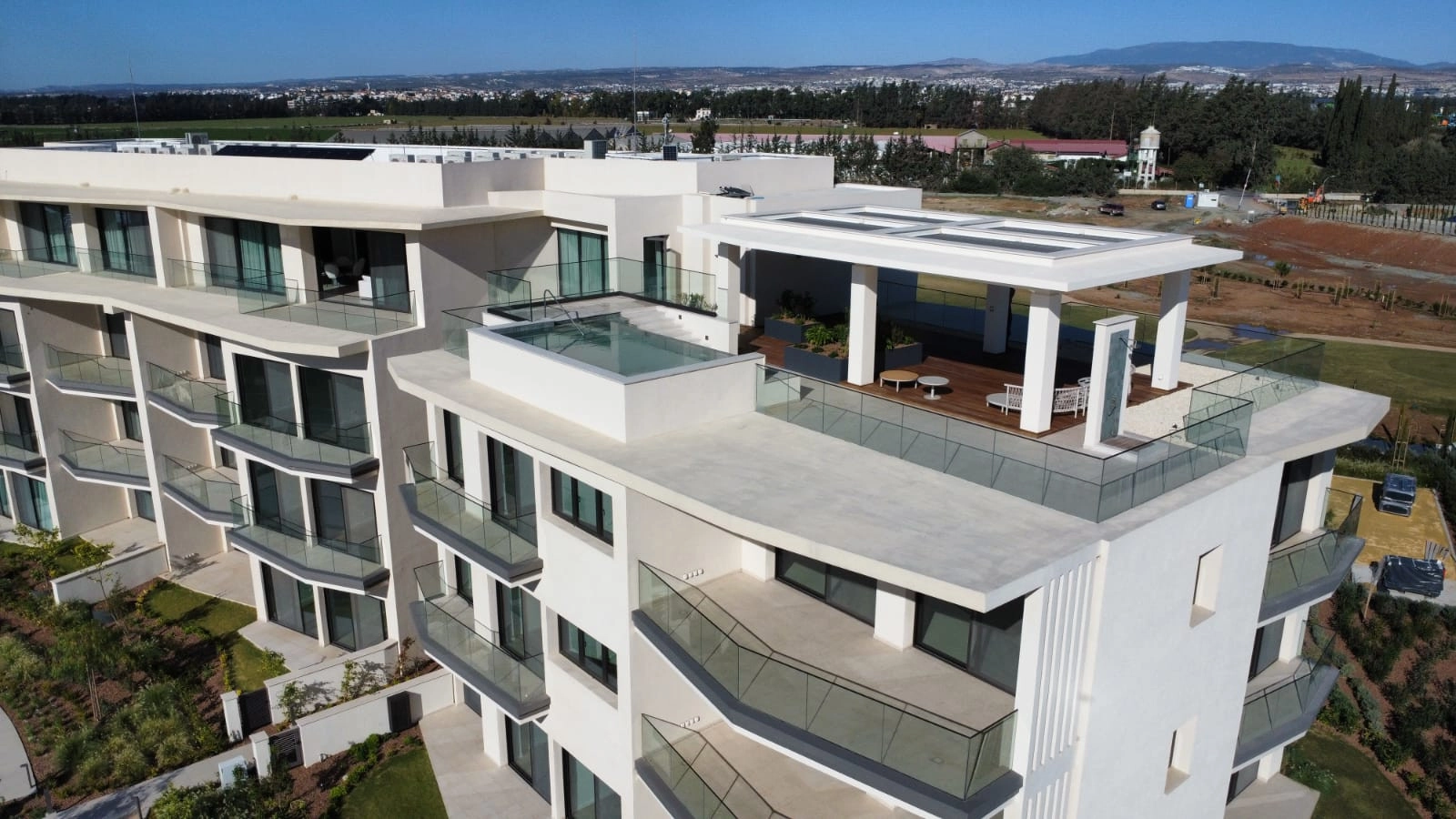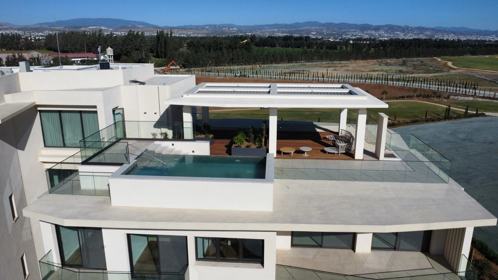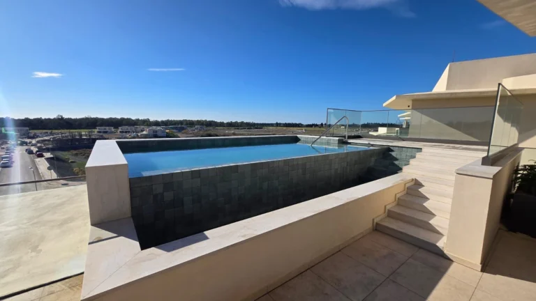 The crown jewel of the property is its private rooftop terrace, complete with a heated swimming pool, expansive sun deck, and outdoor lounge areas. From here, enjoy panoramic views across the golf course, mountains to the north, salt lake, and the sea to the south—ideal for sunset entertaining or private relaxation.
