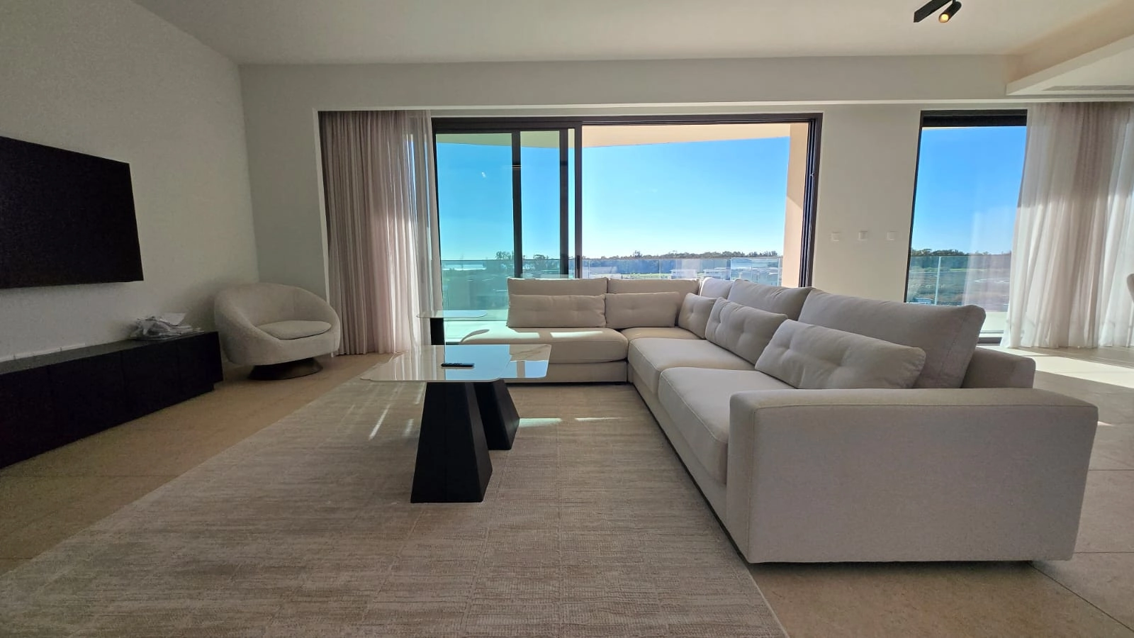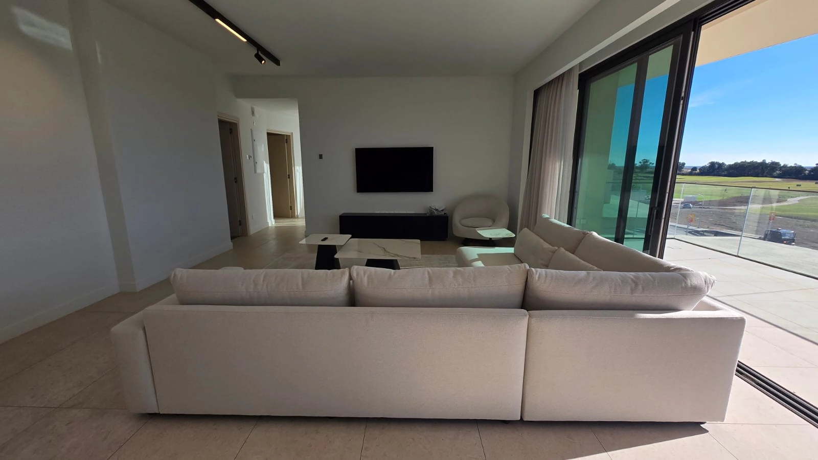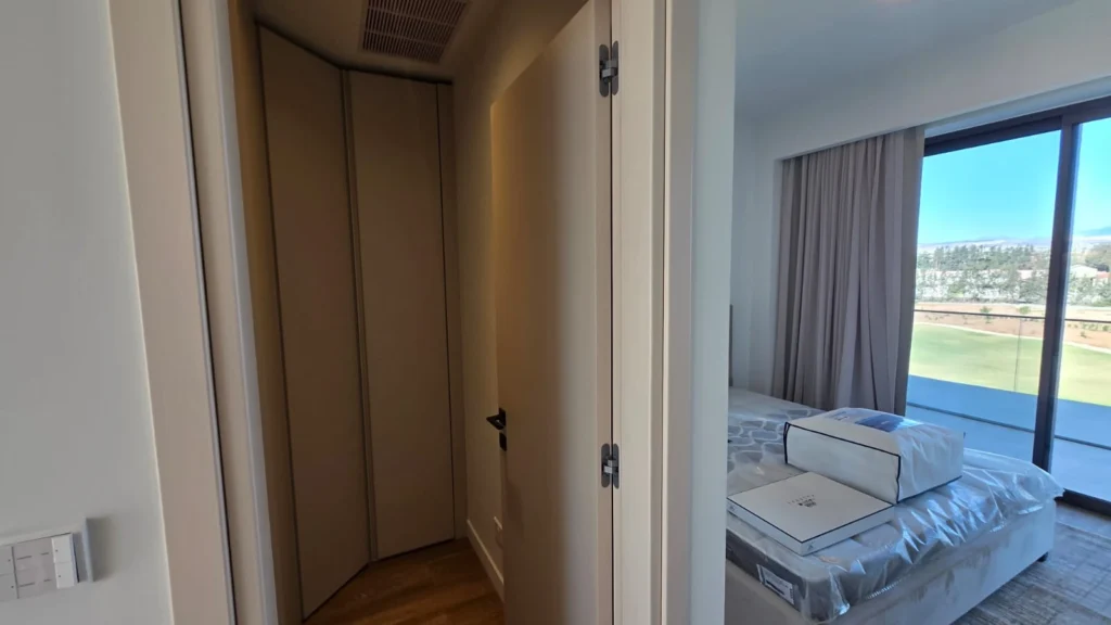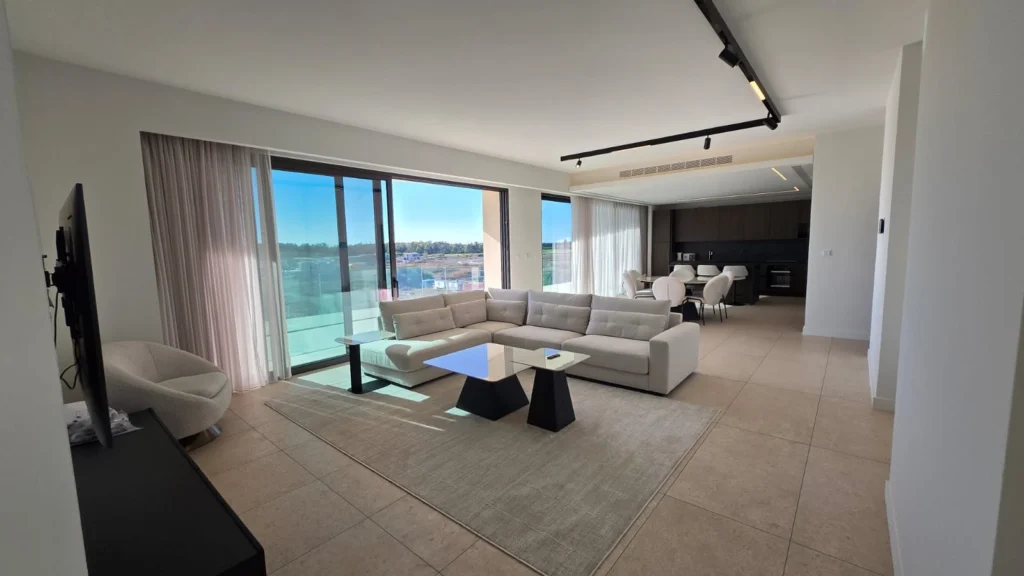The residence features a bright open-plan living and dining area, framed by floor-to-ceiling glazing and surrounded by wrap-around balconies with direct access from every bedroom. The living space enjoys unobstructed views of the golf course, salt lake, and the Mediterranean Sea, creating a constantly changing natural backdrop.