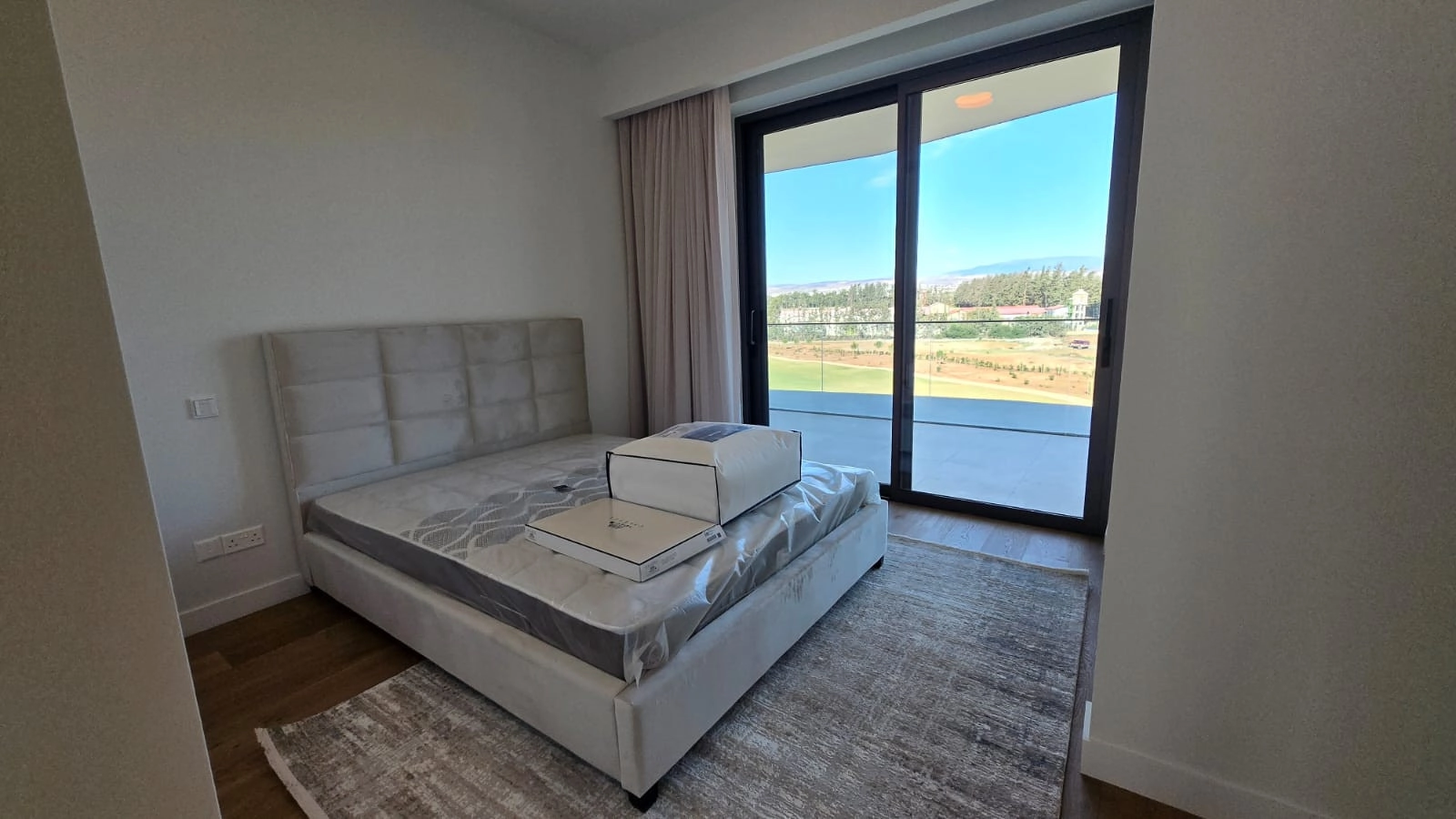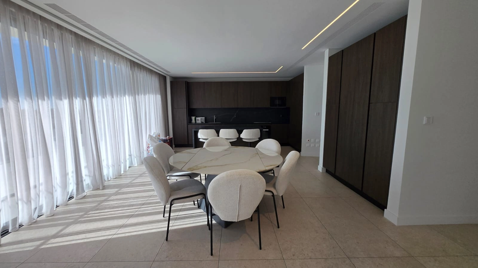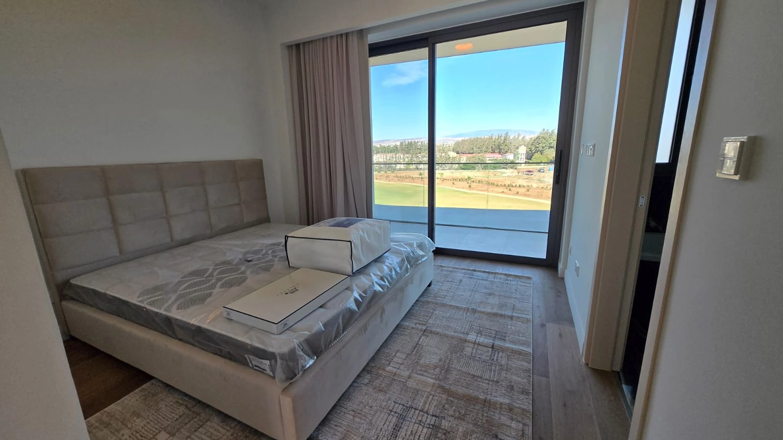 The residence features a bright open-plan living and dining area, framed by floor-to-ceiling glazing and surrounded by wrap-around balconies with direct access from every bedroom. The living space enjoys unobstructed views of the golf course, salt lake, and the Mediterranean Sea, creating a constantly changing natural backdrop.