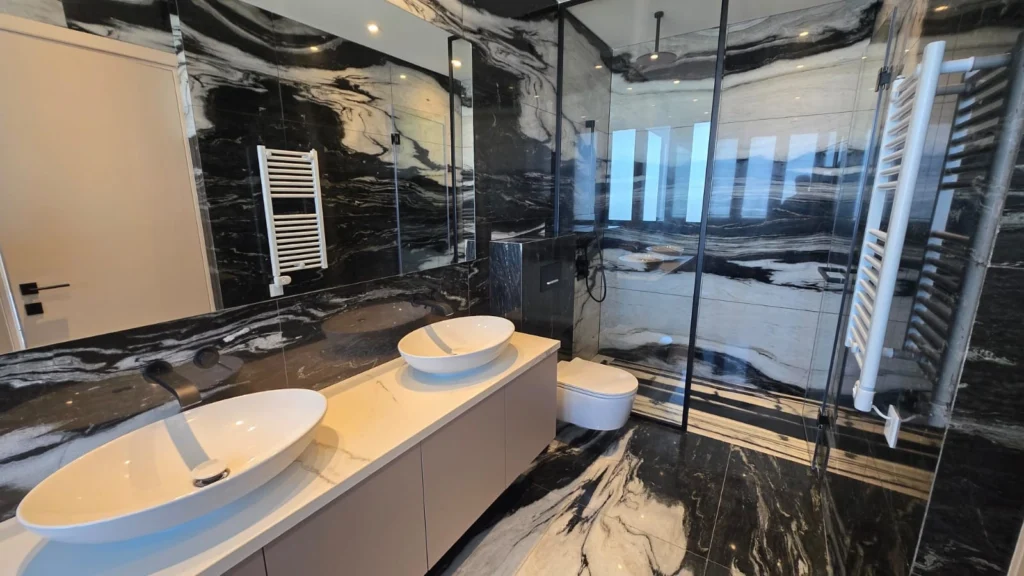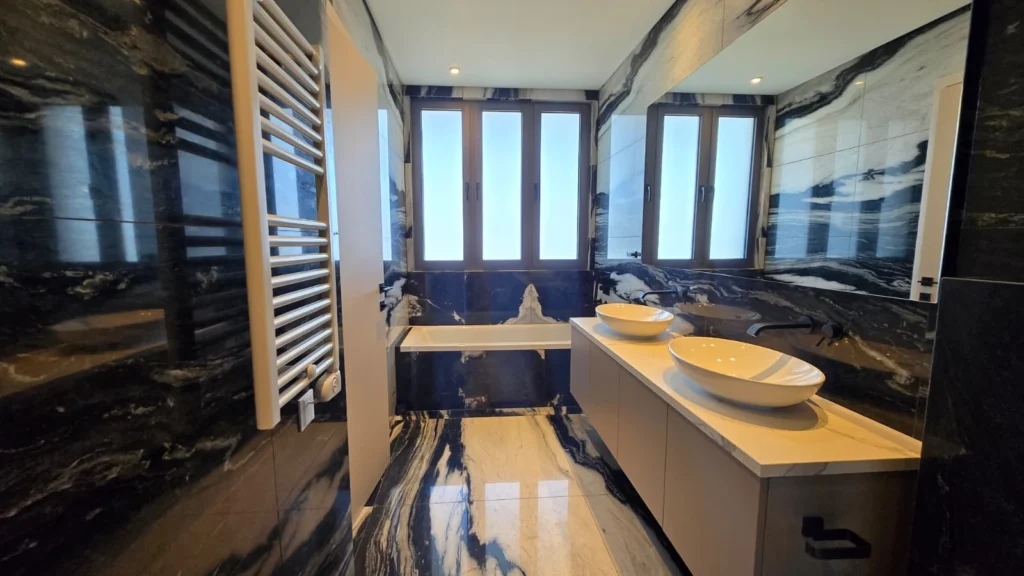The penthouse is offered fully furnished with brand-new, designer furniture, complemented by top-tier kitchen appliances and bespoke finishes throughout. Every bedroom benefits from its own en-suite bathroom, while the master suite further features double sinks, a walk-in shower, and a full bathtub, delivering true hotel-level luxury.