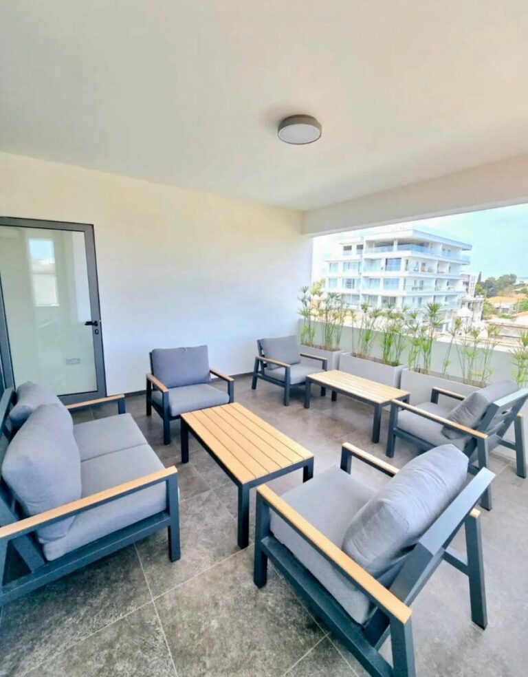 RENT apartment Zakaki, Limassol. 2 bedrooms. 2 bathrooms. Fully furnished. Air conditioners in all rooms. Modern interior. Spacious balcony. Washing machine. Dishwasher. In the Sunset Garden complex near MyMall with spa, gym, pool, paddle and tennis court. Price 3000 euros + deposit. R1217 L627