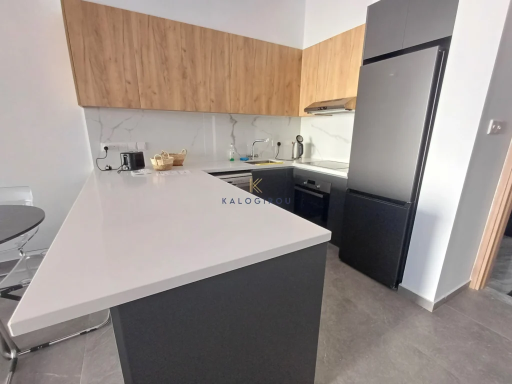 Modern apartment for Rent in Livadia area. The property consists of an open plan kitchen and living room with dining area, a large covered veranda, 2 bedrooms, one en suite shower with wc and a family bathroom with a shower unit and a toilet.