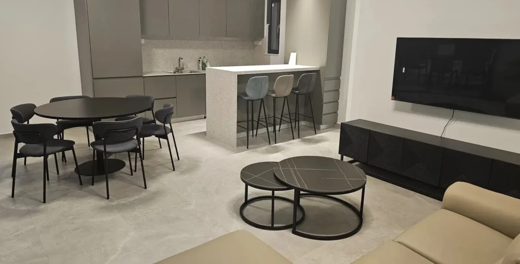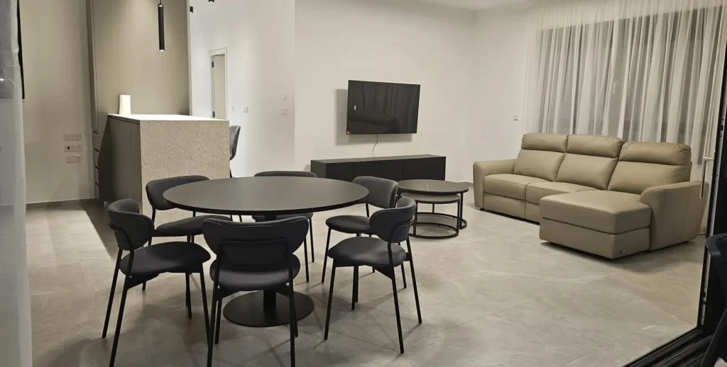 Two-bedroom apartment of 115 m2 for rent in Kapsalos area, Limassol. The apartment includes two bedrooms, two bathrooms, an open-plan kitchen with an island, a living room, a covered veranda, a balcony and a storage room. The apartments are fully furnished and equipped with household appliances, including air conditioning in all rooms, a wall-mounted TV in the living room, a washing machine and a dryer, and a photovoltaic system that significantly reduces energy costs. The apartment is located on a quiet residential street, with convenient access to urban infrastructure. Outdoor parking is provided. The property is new, built in 2024, with energy efficiency class A and no general expenses. The apartment is located on the 1st floor. Pets are not allowed. The minimum rental period is 12 months.