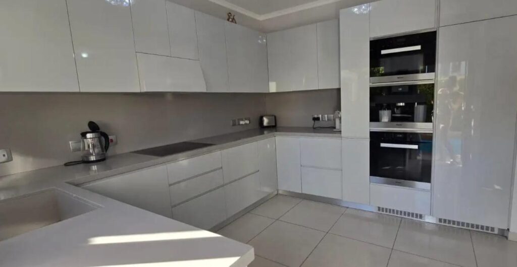 RENT – Modern 4-bedroom house with pool. Excellent location – only 300 m to the beach and Metro and Lidl supermarkets. Equipped with Miele appliances and ready for occupancy. Bedrooms: 4. Bathrooms: 2 + guest WC. Area: 160 m². Plot area: 200 m². Year of construction: 2010. Energy efficiency: B+. Fully furnished. Heated pool with fountain and shower. Gym, Balcony, pantry, alarm. Rent: 3900 € / month – negotiable.
