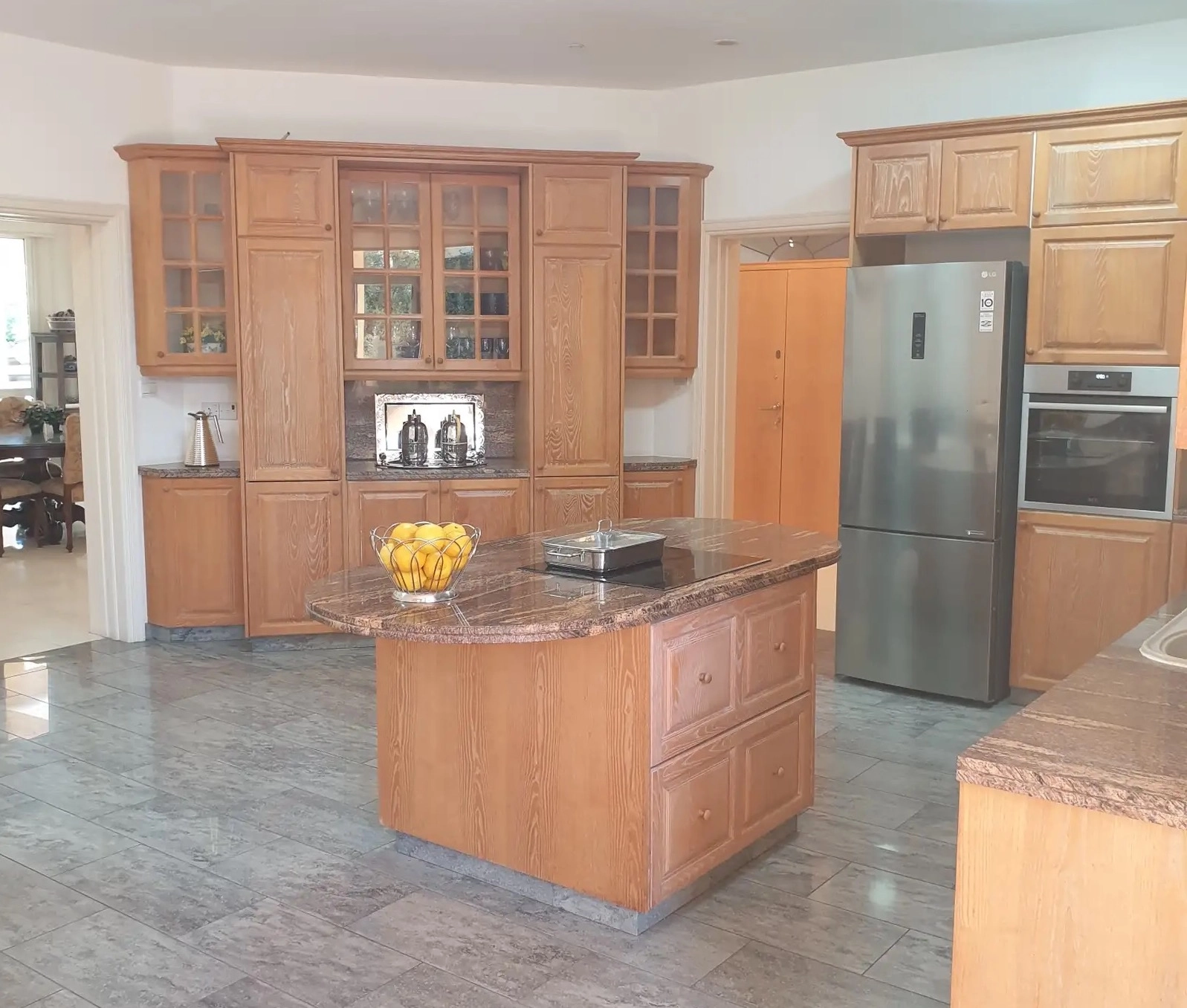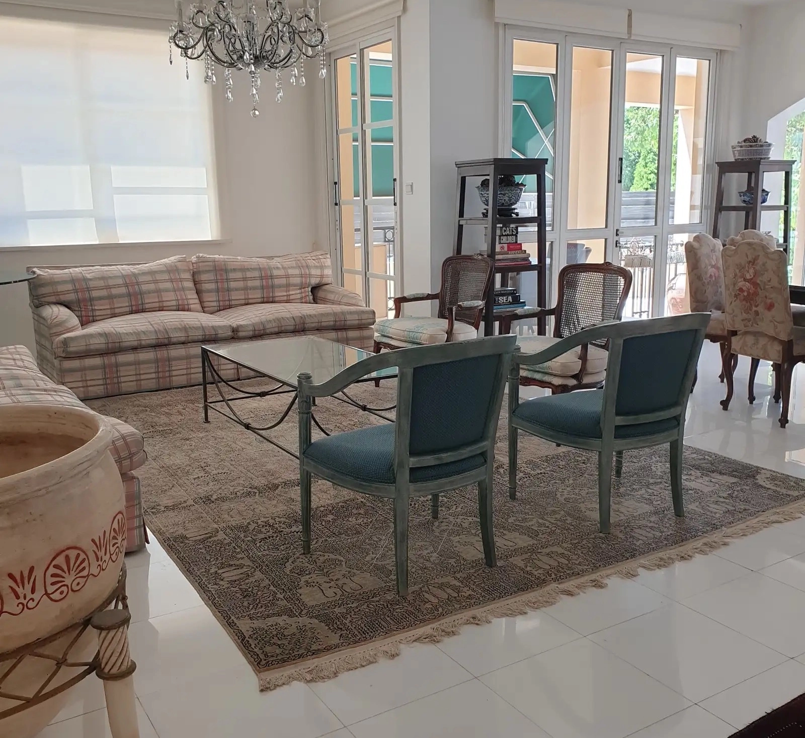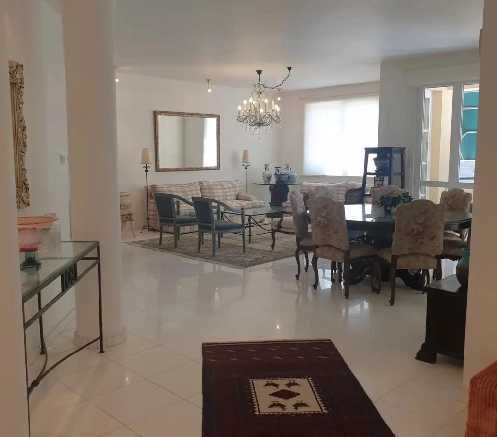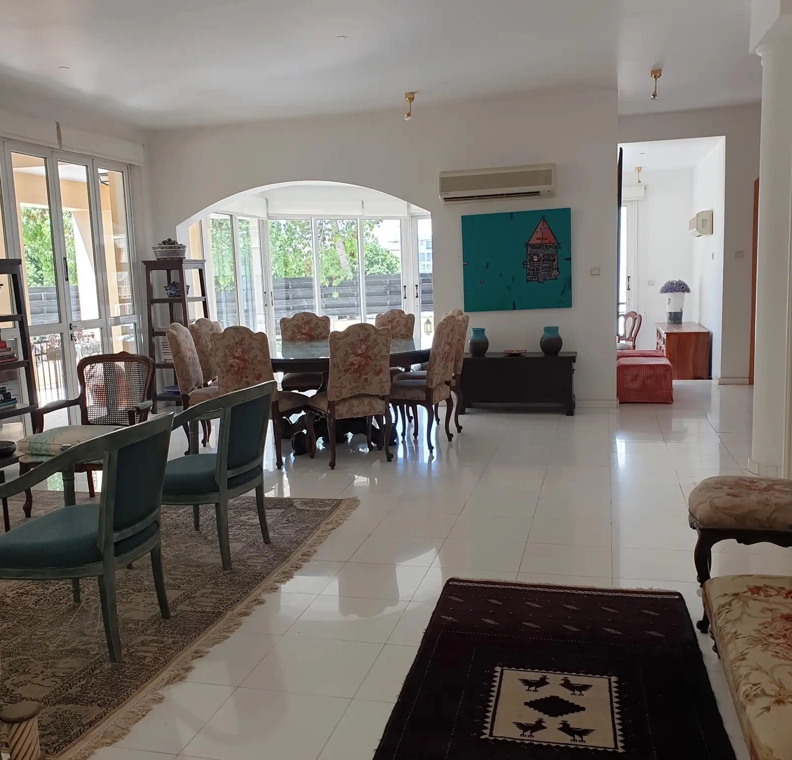 Four-bedroom apartment of 330 m2 for rent in Strovolos, Nicosia. The apartment is located on the ground floor. The apartment includes four bedrooms, an office, three bathrooms, a guest toilet, a kitchen with an island, an open living and dining area with a fireplace, a family room, a laundry room, balconies, a garden, and storage rooms.The apartments are unfurnished, the furniture is discussed separately and partially available for sale, equipped with underfloor heating, air conditioning in all rooms, solar panels, built-in hob and AEG oven, Villeroy & Bosch plumbing fixtures, Hans Grohe and Hansa faucets, and are decorated with Thasos marble, granite and marble countertops and kitchen cabinets. cabinets made of solid wood.The property is located in a family boutique house on the same level with a comfortable layout without height differences, has access to a garden with mature trees and a spacious front porch, is a 10-minute drive from the central business district, The Mall of Cyprus, embassies and with quick access to the motorway, as well as a 6-minute drive from Aretaieio Hospital. Additionally, there is a covered parking in the underground level with an elevator leading directly to the entrance to the apartment, a separate storage room in the basement, high ceilings with panoramic sliding doors from floor to ceiling, general expenses are included, pets are not allowed.