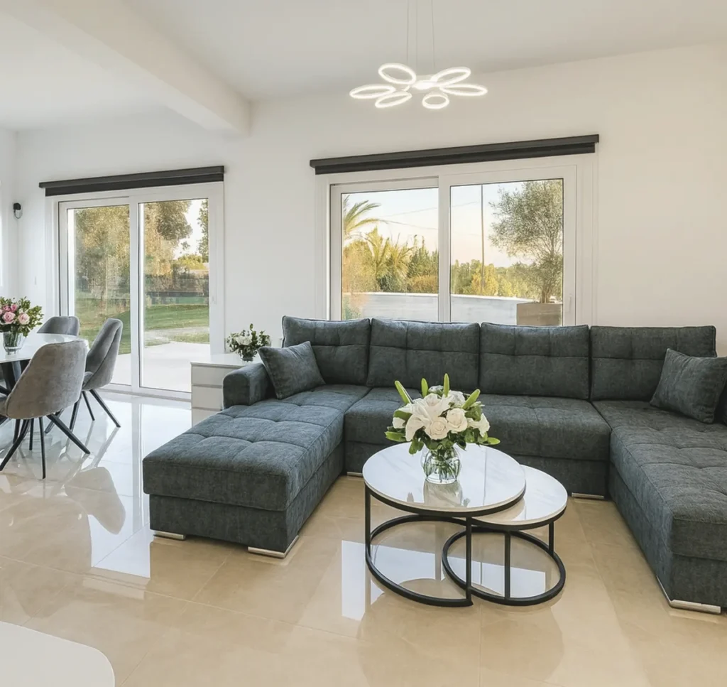 Located next to the Captain St. George “Farm” and within walking distance of the resort and beach, this brand new 4-bedroom villa offers modern comfort, privacy, and nature. Set on a fully fenced 638 m² plot with a private olive orchard, it enjoys uninterrupted 180° sea views.