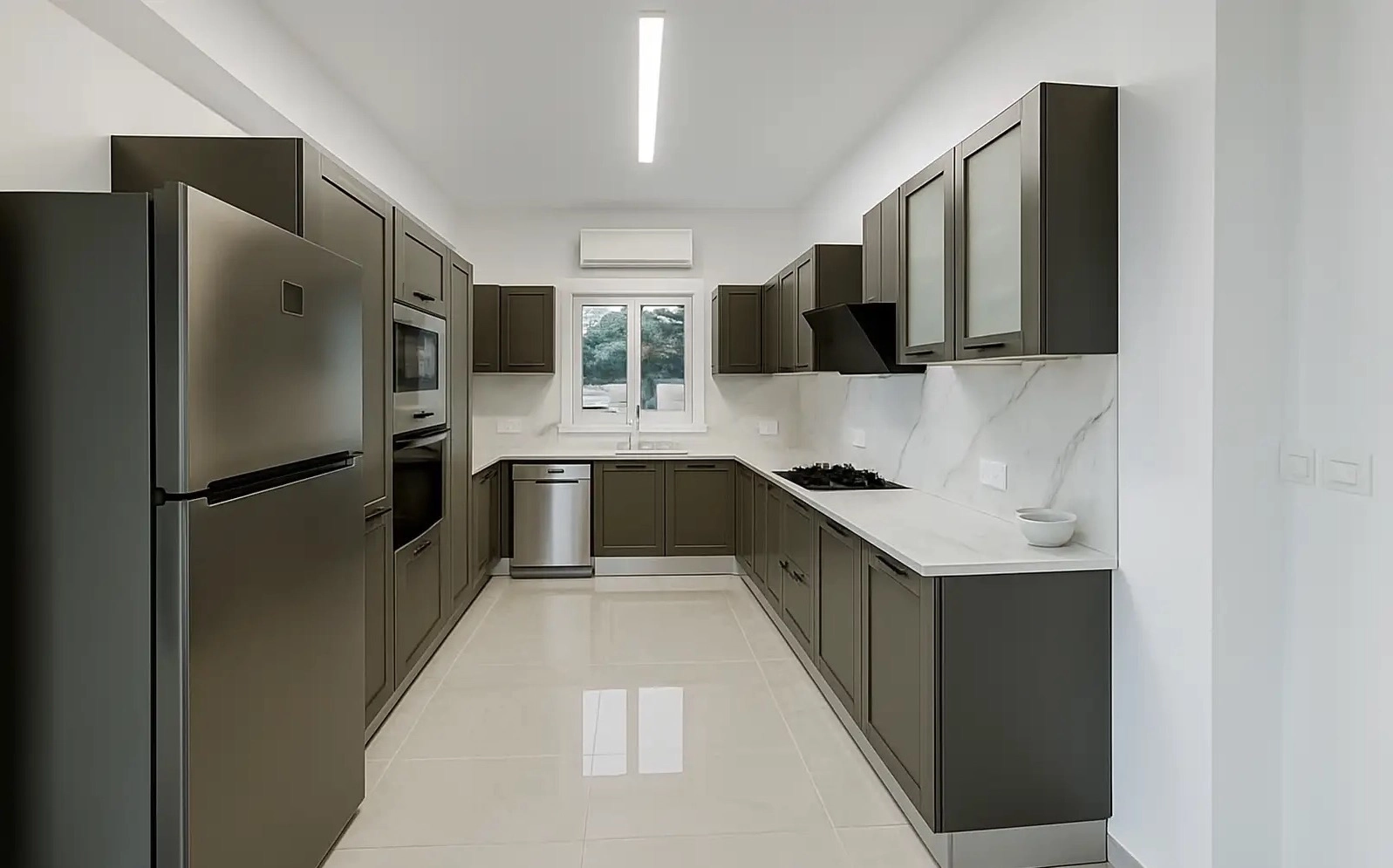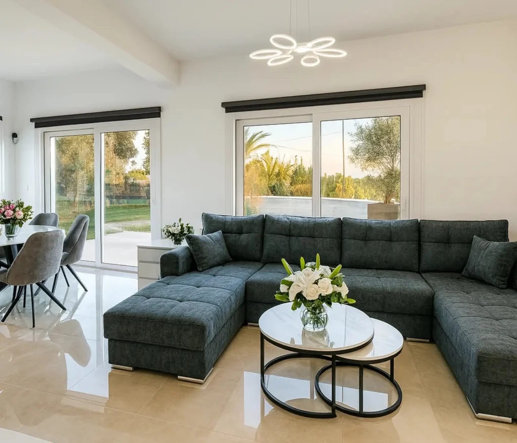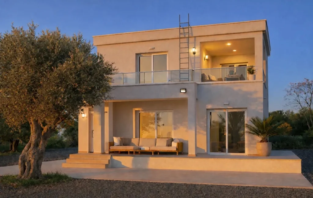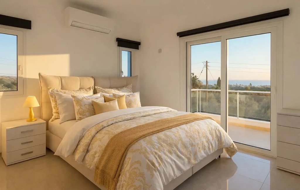 For rent a four-bedroom villa with a covered area of 160 m2 on a plot of 638 m2 in the area of Pegeia, Paphos. The villa includes 4 bedrooms, 3 bathrooms, a kitchen, a spacious living room, a game room, balconies, storage rooms and additional storage areas. The residence is fully furnished and equipped with household appliances and engineering systems, including a gas stove, high-quality kitchen appliances, an air conditioning system, solar panels for hot water and lower cooling costs, two large water tanks, a professional alarm system, indoor and outdoor CCTV cameras, fire sensors and exterior lighting around the perimeter. The villa was built in 2024 and is characterized by high energy efficiency class A and modern high-tech solutions. The house is located on a fully fenced plot with an olive grove and 180° panoramic sea views. The layout is made on two levels, there are several balconies with views of the sea and olive trees. The bedrooms have built-in storage systems under the beds, additional storage areas are integrated into the sofa in the living room. The guest bedroom and study are equipped with high-quality sofa beds. The territory has two separate storerooms, two independent entrances and three entrances with gates, which ensures a high level of privacy and security. There is an outdoor recreation area with a horizontal bar and bars in the courtyard. The property is ideal for long-term rental, available for immediate occupancy.The property is located next to the Captain St. George “Farm” and within walking distance from the Captain St. George Resort, close to beaches, coastal routes and the entrance to the Akamas Peninsula with hiking, jogging and cycling paths.