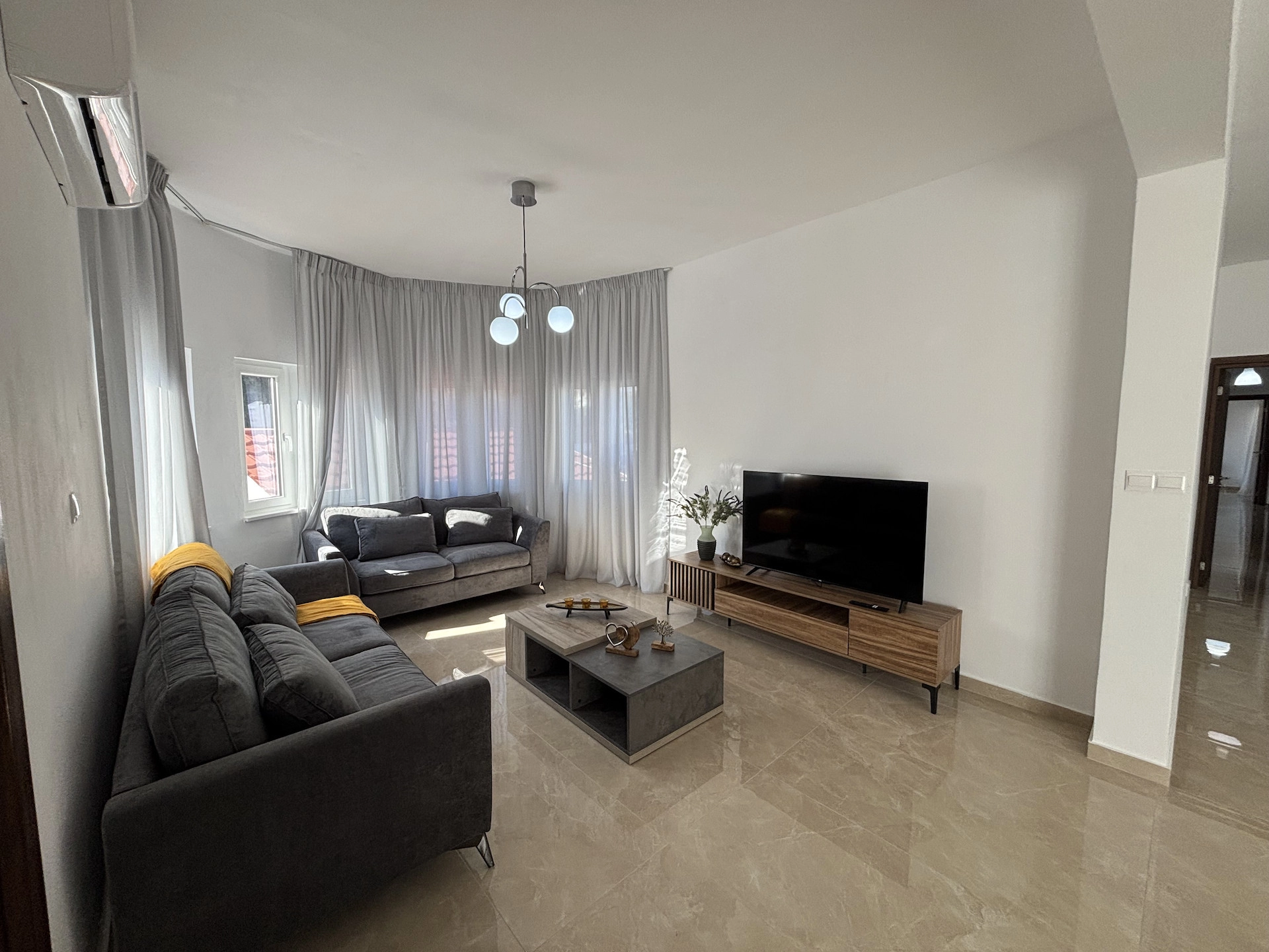 Available for rent is a spacious semi-detached house located in the desirable Tsirio area. With a generous internal space of 150 m2 + 40m2 veranda , this home is perfect for families or professionals seeking comfort and convenience. The property offers three well-sized bedrooms and one modern bathroom, all situated on the ground floor for easy access.